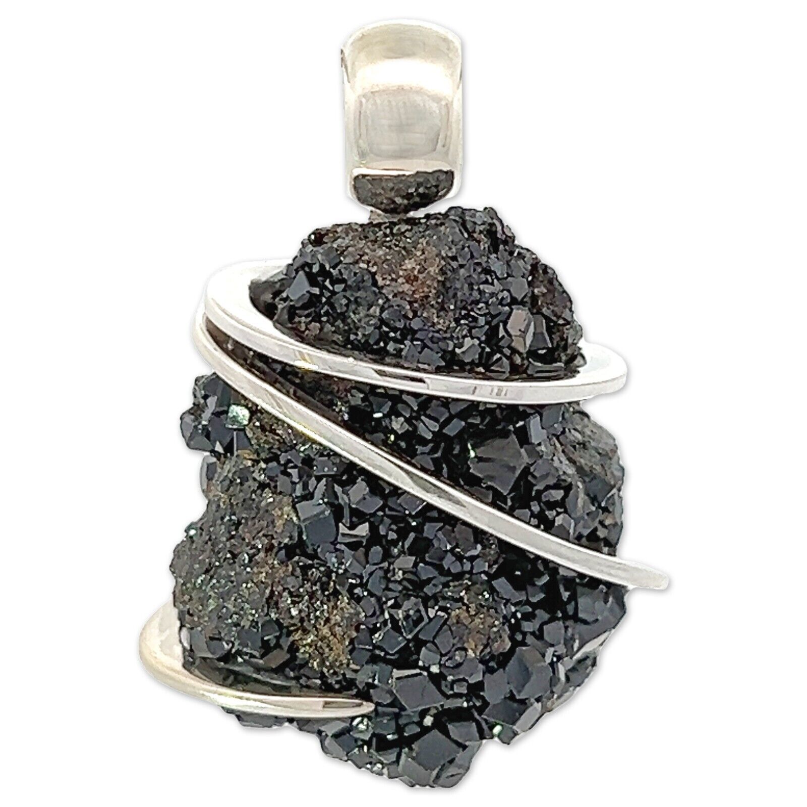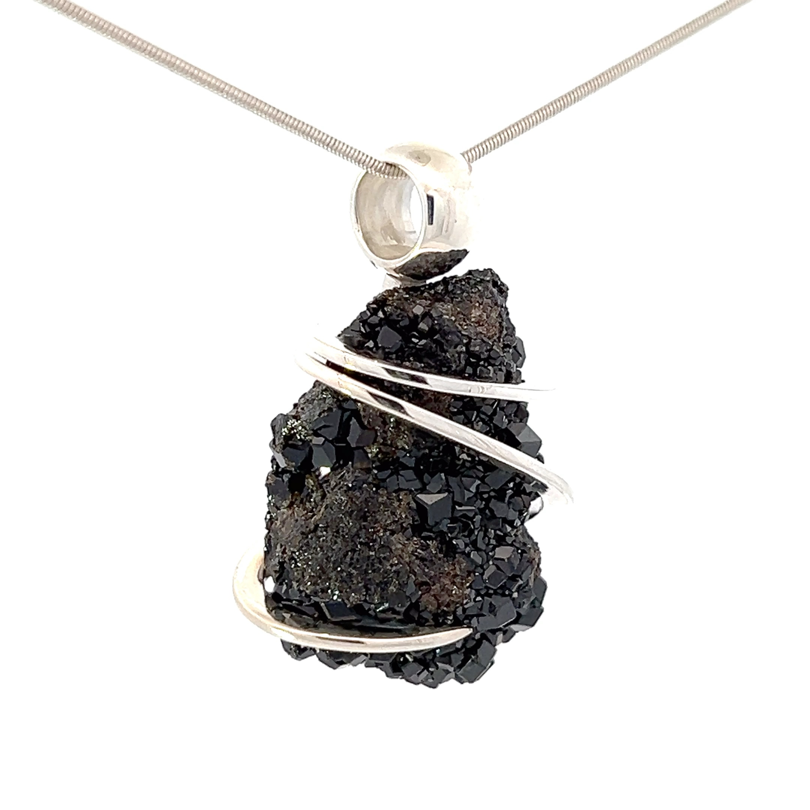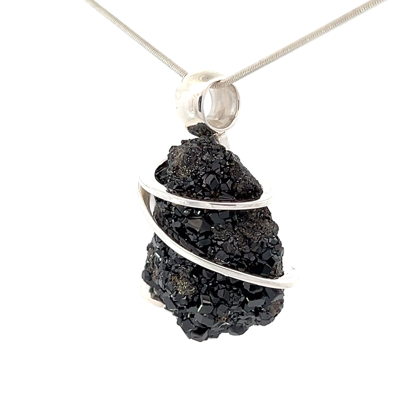 This eye-catching Black Garnet Crystal pendant necklace has been molded in 925 sterling silver. Stone from Russia. Designed in Sedona, Arizona by Starborn.