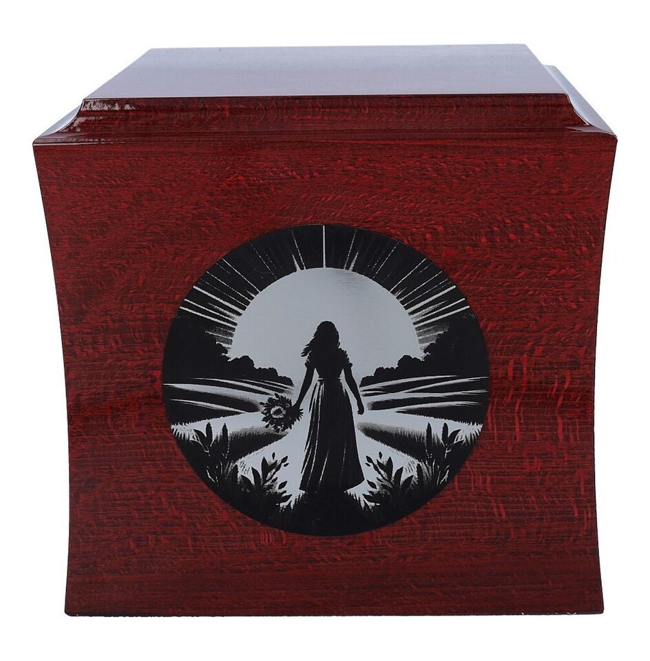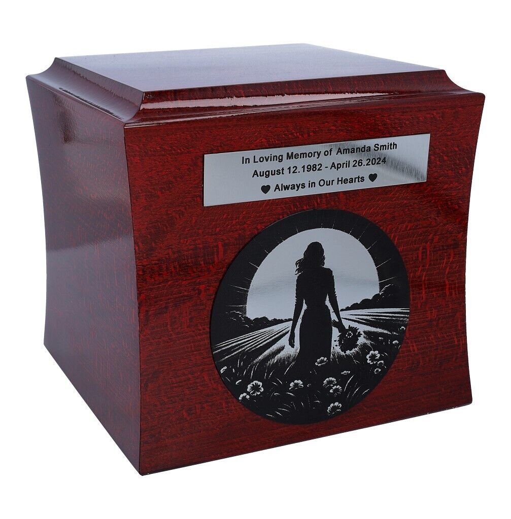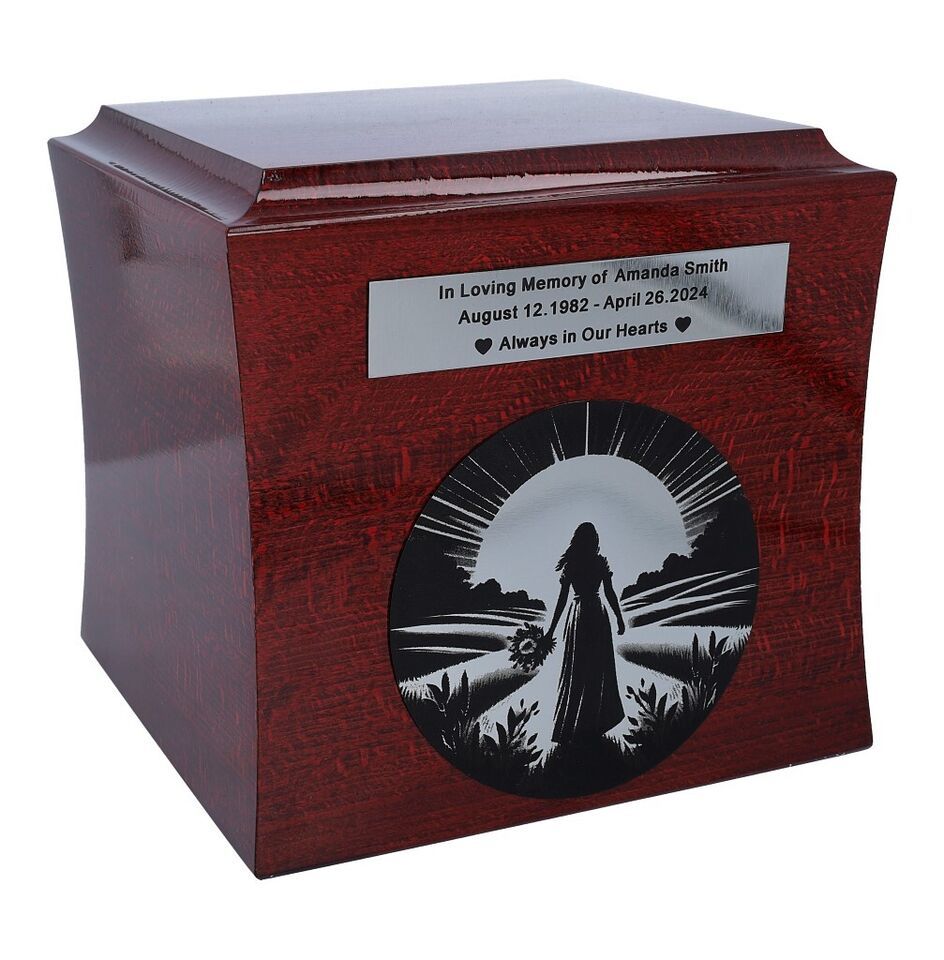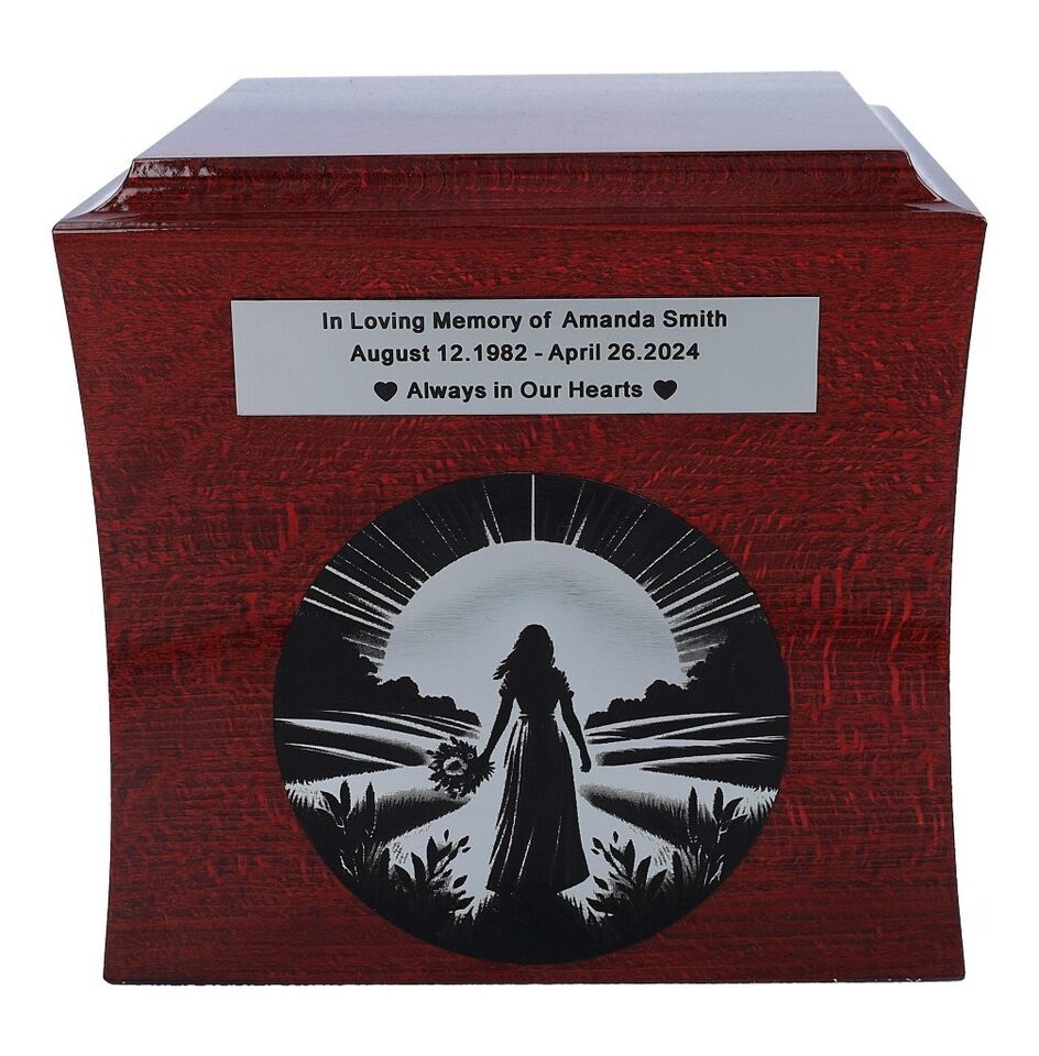 An urn with engraved text and a graphic depicting a woman walking towards the light symbolizes an eternal journey and the transition to another dimension. This moving image aims to bring comfort and a sense of peace, reminding us that despite the physical loss, the spiritual presence of our loved one remains with us forever. The engraved text adds a personal touch, commemorating the memory of the deceased in a respectful and loving manner.