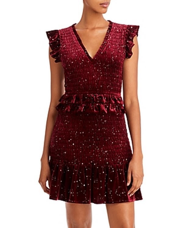 E FIT Fits true to size, order your normal size High-stretch fabric Designed for a mini length Approx. 32 from back of neck to hem, based on a size small Model measurements: 510 height, 33.5 bust, 23.5 waist, 34.5 hips, wearing a size small PRODUCT DETAILS V-neck Pullover style Short flutter sleeves Smocked bodice A-line mini skirt This item is part of our 100% Bloomingdales collection, featuring exclusive pieces you wont find anywhere else. Imported