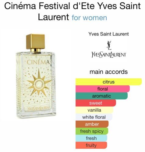 Cinema Festival d'Ete by Yves Saint Laurent is a Oriental Floral fragrance for women. Cinema Festival d'Ete was launched in 2006. Top notes are Clementine, Rosemary, Lemon, Almond Blossom, Clary Sage and Mandarin Orange; middle notes are Jasmine, Amaryllis, Peony and Tiare Flower; base notes are Vanilla, Amber and White Musk.