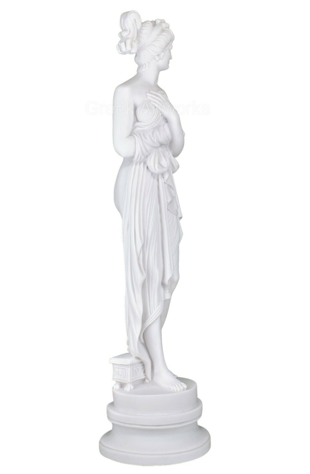 Notre statue est basee sur la sculpture connue sous le nom de « Venus Italica » d?Antonio Canova. Canova a sculpte la Venus Italica originale en 1819 pour remplacer l'ancienne Venus romaine des Medicis, saisie par Napoleon en 1802 a la Galerie des Offices a Florence. Dans le veritable esprit neoclassique, Canova a decide de reinterpreter l'?uvre ancienne plutot que de sculpter une replique exacte. S'inspirant d'autres statues classiques de la deesse, il a apporte plusieurs changements importants a la figure ; en consequence, sa Venus semble plus naturelle et son mouvement plus doux que la Venus des Medicis. La Venus Italica a ete immediatement saluee comme le chef-d'?uvre de Canova et un digne successeur de l'ancienne Venus.