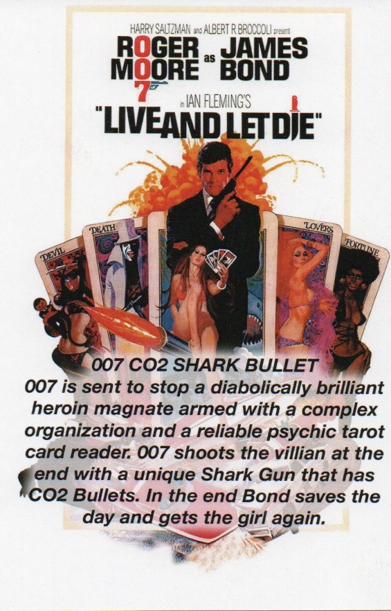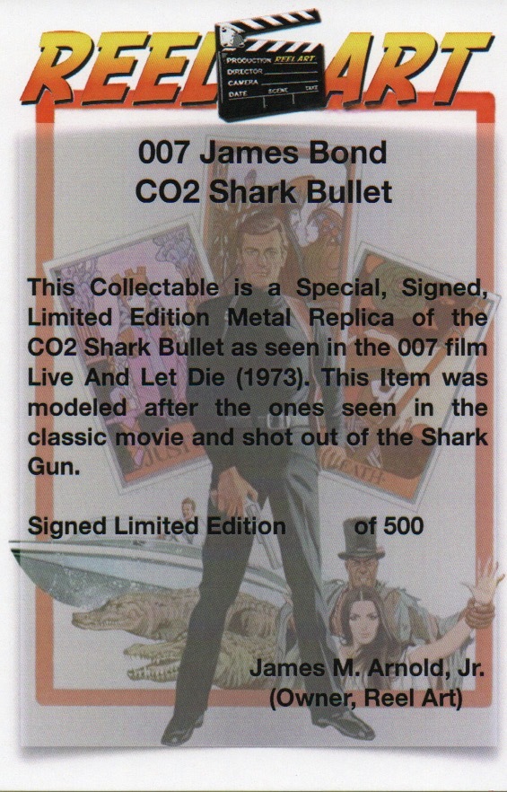 This is a Exclusive, Signed, Numbered, Limited Edition Real Prop Replica of the 007 James Bond CO2 Shark Bullet as seen in The 007 thriller Live and Let Die (1973) starring Roger Moore as agent 007. The 007 CO2 Shark Bullet is a, Non-Functioning, Artists Rendering created from various Photographs, Books and how it appears in the Film. Each item Comes Complete with a Double Sided, 4 x 6 inch, Full Color, Professionally Printed, Certification Card. This Documentation contains Poster Art and Explains in Detail about the 007 CO2 Shark Bullet and how it was used in the film. Real Prop Replica CO2 Shark Bullet comes Brand New inside a Velveteen Bag.