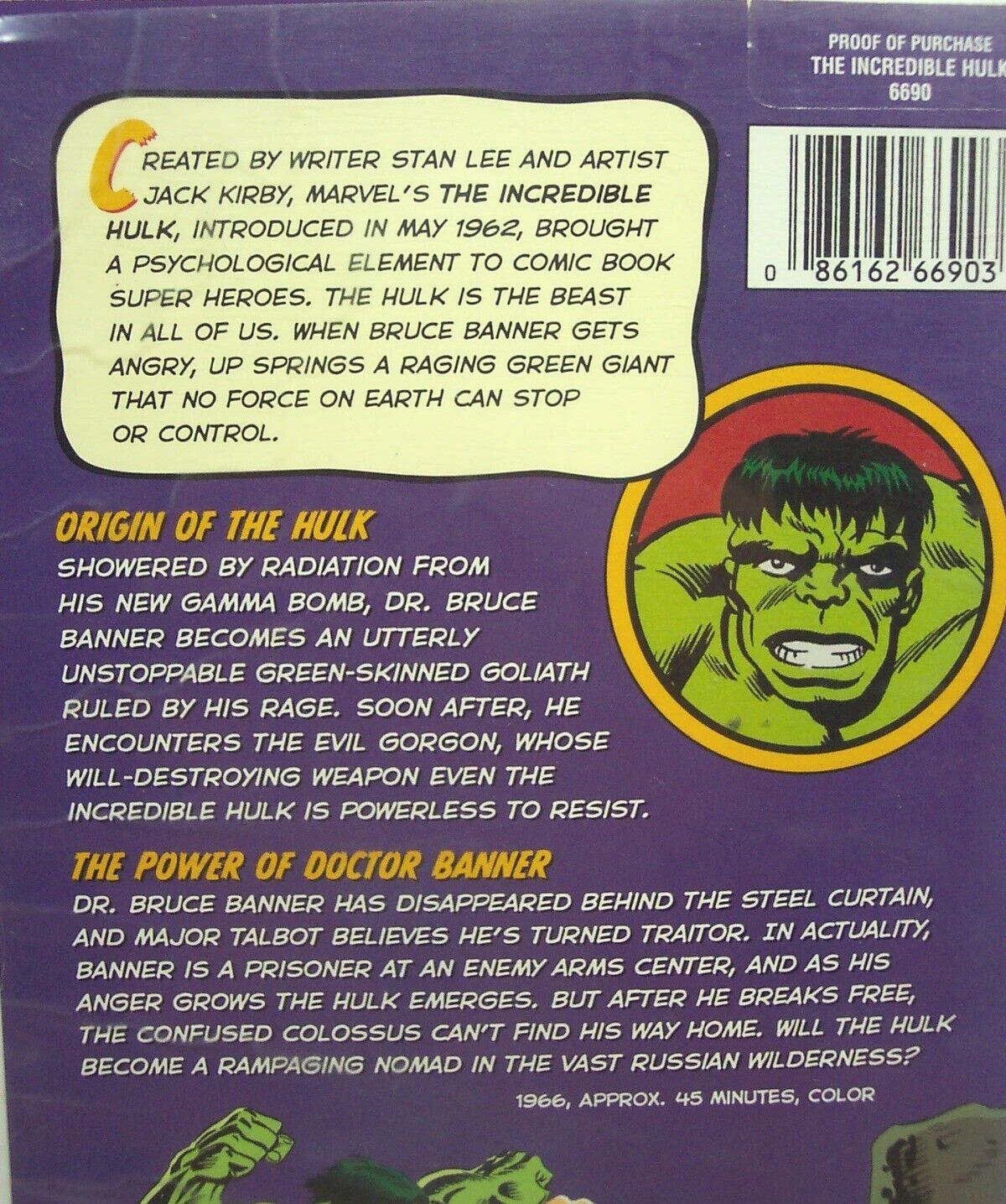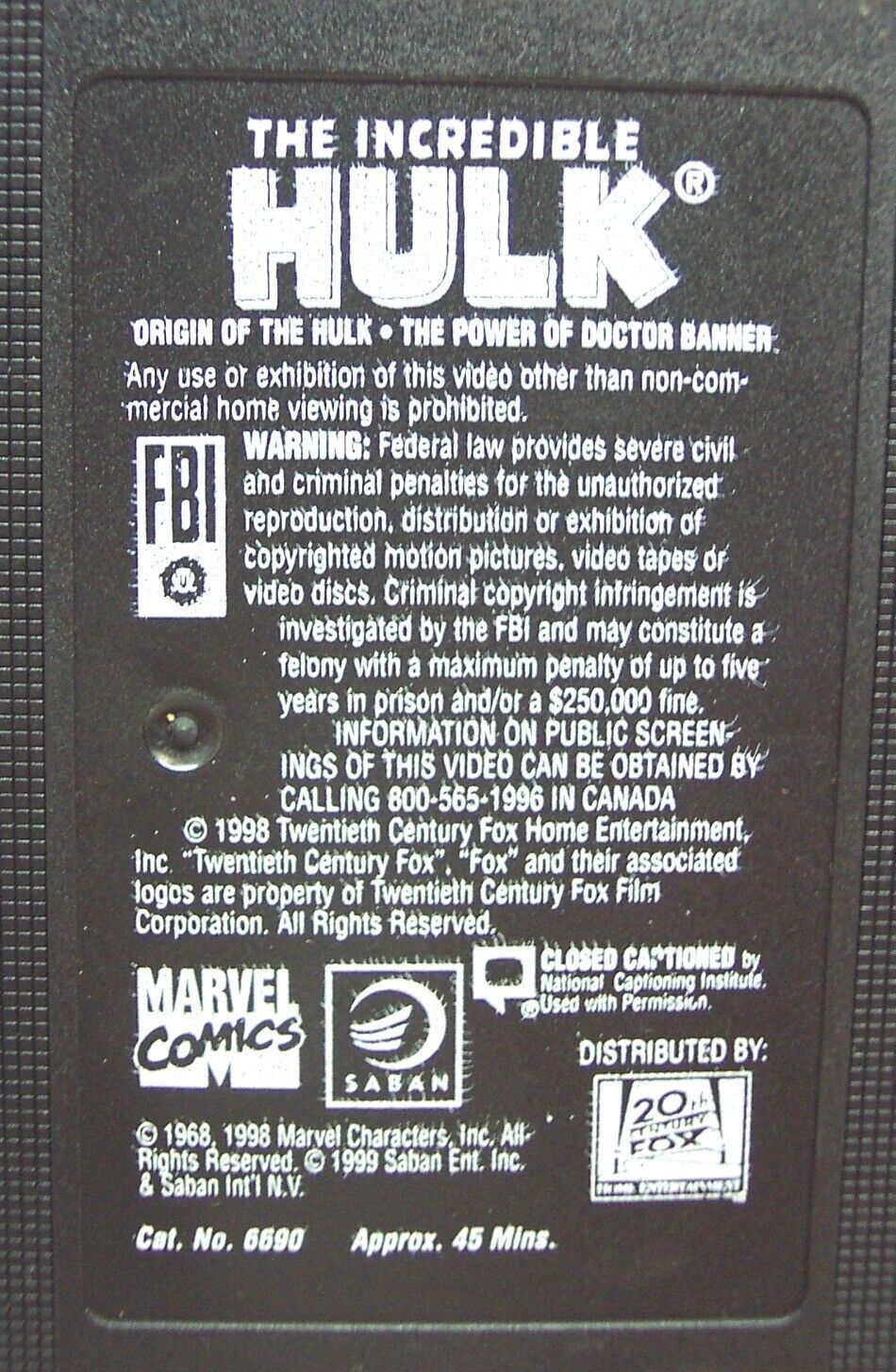 This is Vintage THE INCREDIBLE HULK Origin of the Hulk/ the Power of Doctor Banner Marvel Comics Cartoon VHS VIDEO From 1999. It has a run-time of 45 Minutes. It is in Great Condition. Combine auctions to save on shipping. Please contact me if you need to make other payment arrangements. EAG