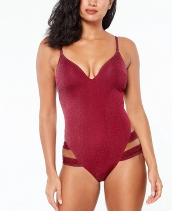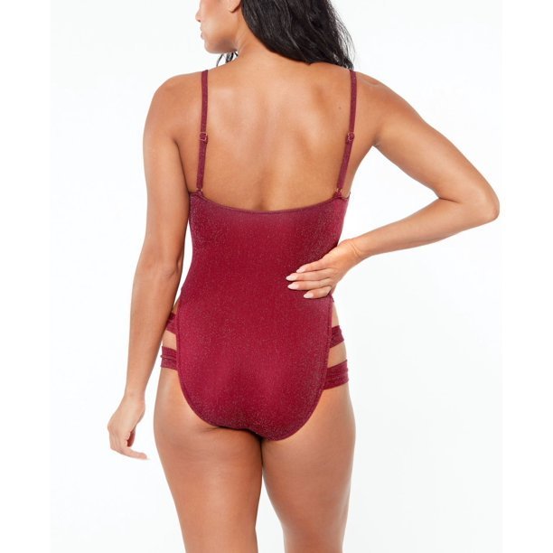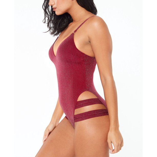 Bar III BLACKBERRY Shimmer Strappy-Leg One-Piece Swimsuit US MediumFeatures: Shine poolside: Bar III s shimmering one-piece swimsuit features strappy details at the leg for added style. Lined. Strappy leg detail. Sweetheart neckline. Non-removable molded cups. Moderate bottom coverage. Pull-on styling; adjustable shoulder straps. Style #: MBSS21217 Shell: nylon/spandex/woven with metallic fibers; lining: polyester Imported.