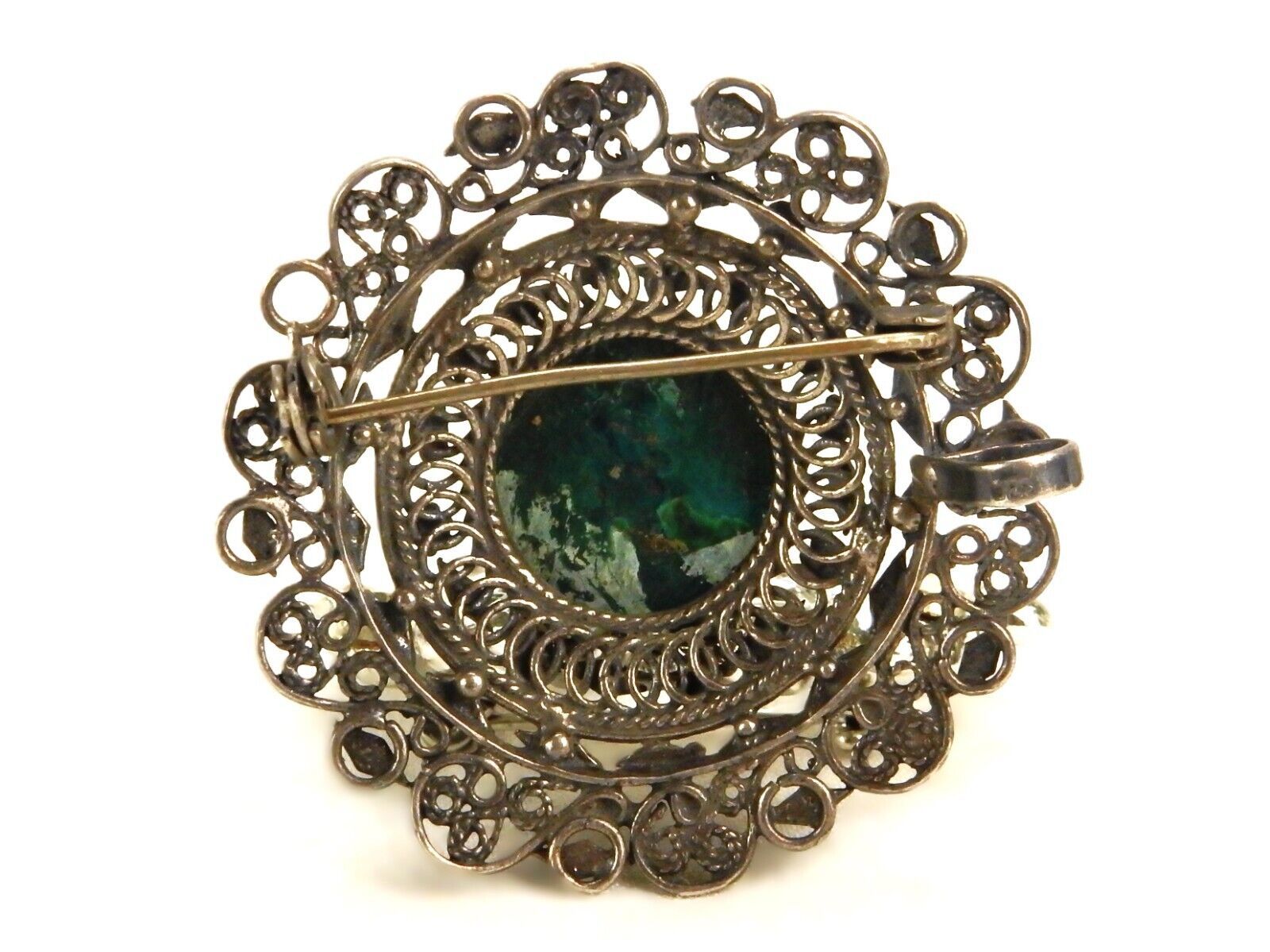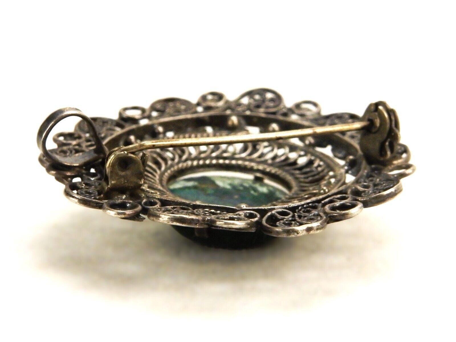 Silver tone metal brooch pin with intricate mesh frame