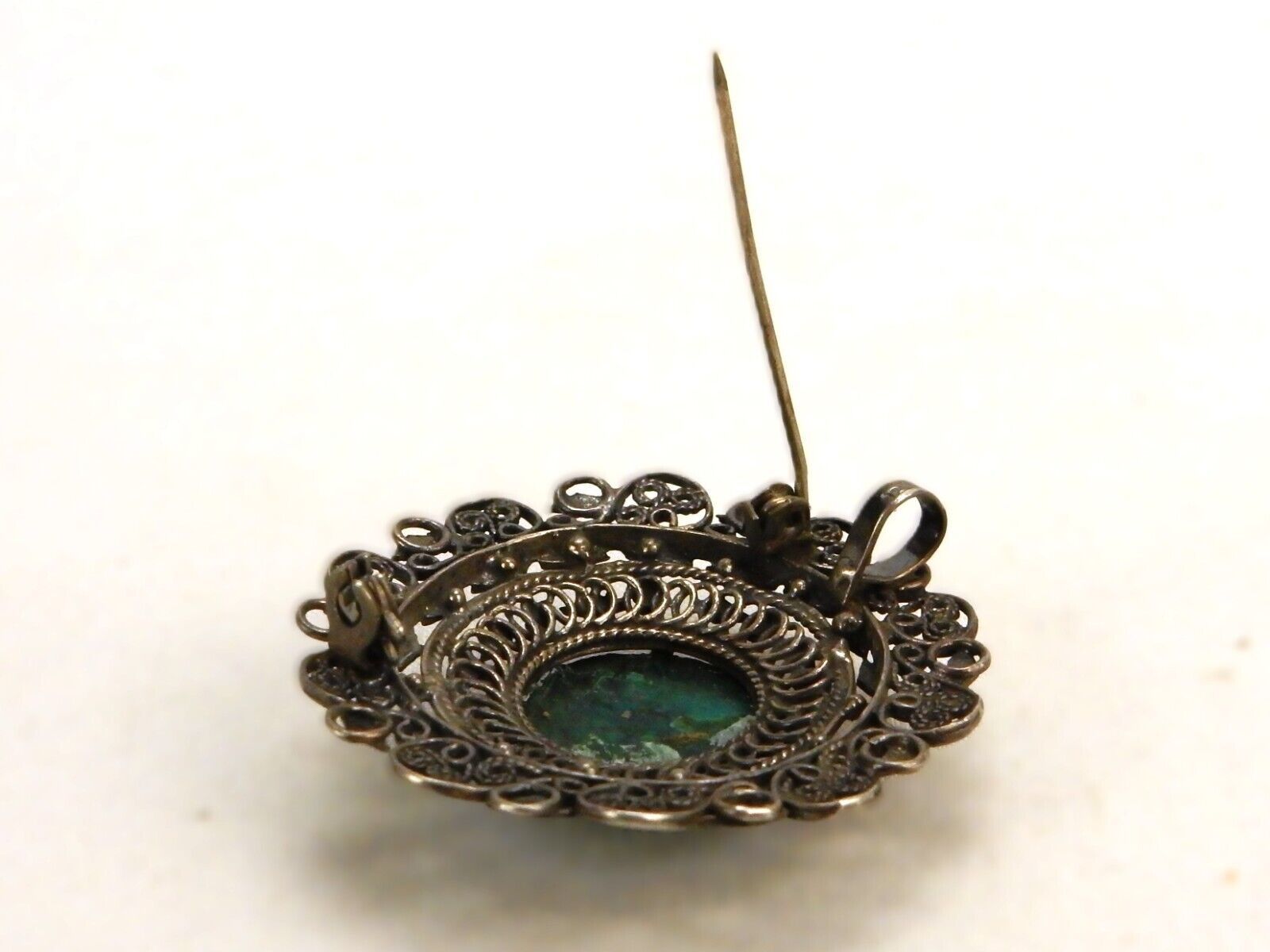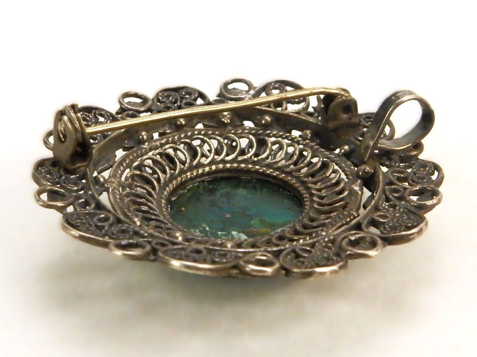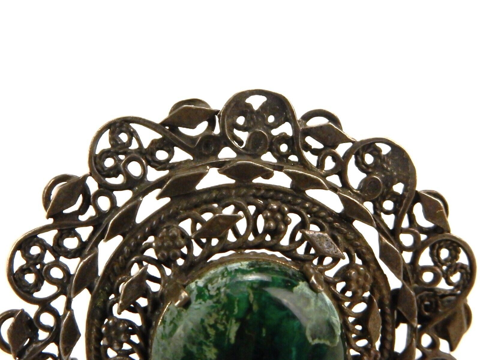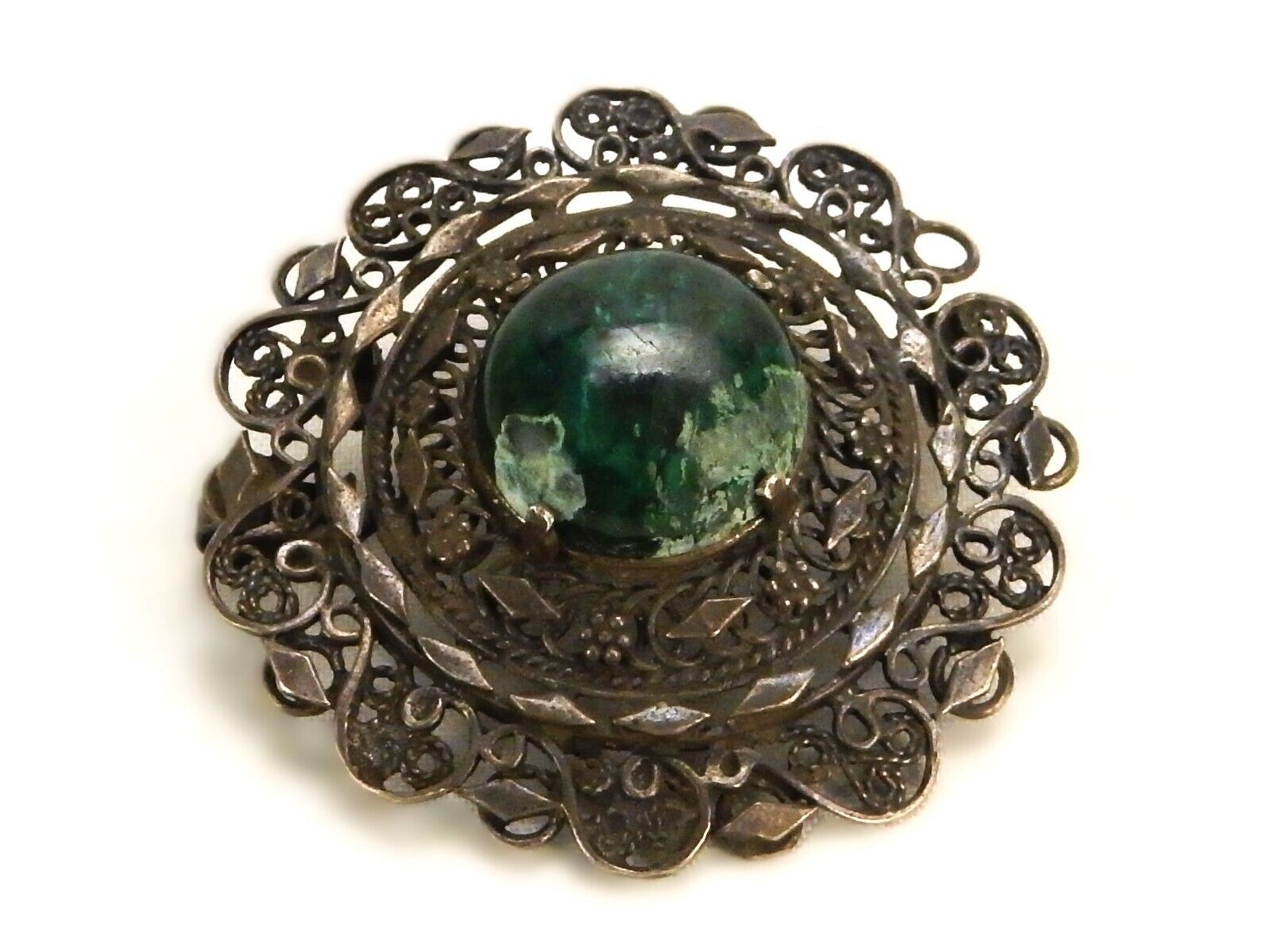 Cabochon Brooch Pin/Pendant, Dark Green Stone, Silver Tone Mesh Frame, #JWL-282