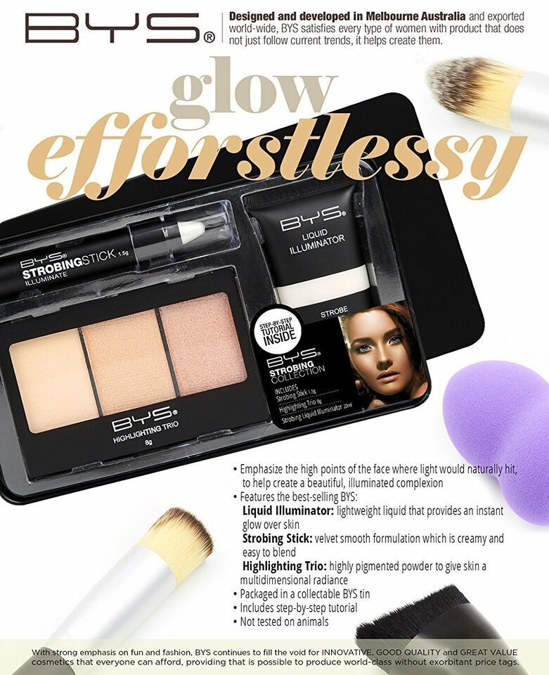 COMPLETE STROBING SET ? This BYS Strobing Collection Kit is the perfect highlighting set. It features a strobing stick, highlighting trio set, and strobing liquid illuminator all packed in a collectible tin.