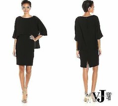 Item Description97% Polyester, 3% Spandex Imported Zipper closure Dry Clean Only Bateau-neck dress featuring high-low popover bodice and slit sleeves Long-sleeve scoop-neck knee-length dress.
