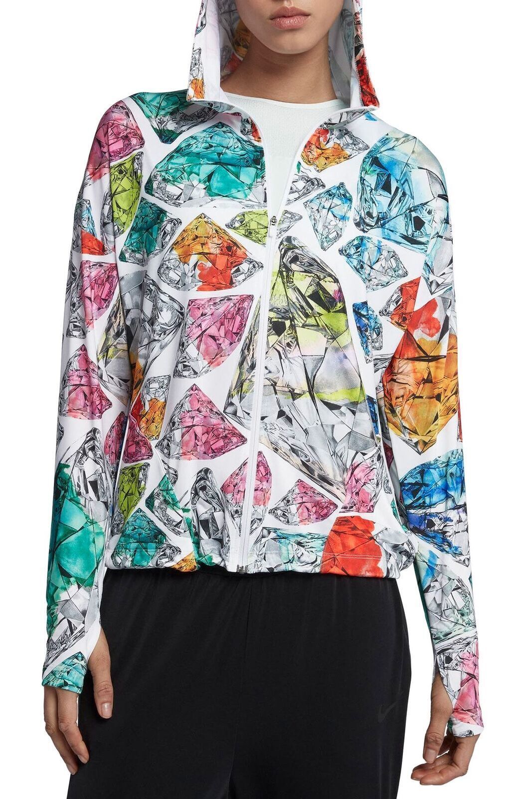 A fun look in training comfort, this eye-catching ensemble from Nike features a perfectly paired performance jacket and cropped pants. A sleek print brings fresh style to this hooded training jacket, in Nike Dry fabric for comfort. Long sleeves that taper to thumbholes and an adjustable hem create a distraction-free fit. Approx. model measurements: height: 59; bust: 32; waist: 25; hips: 35 Model is wearing size small Front-zip closure Hits at hip Attached hood with drawstring Nike Dry fabric for comfort; long tapered sleeves with thumbholes; drawstring at hem Polyester/spandex Machine washable Imported