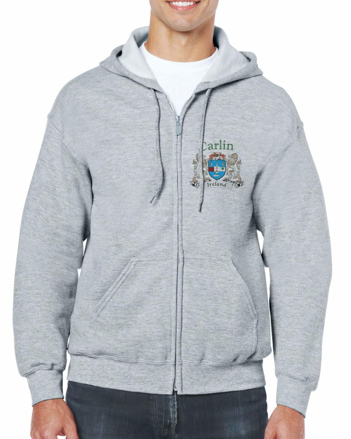 Product description: Carlin Irish Coat of Arms Full Zip Hoodie in Ash. Every Irish family has a story to tell-probably hundreds of stories. Your Irish coat-of-arms is a visual record of your family's oldest, most significant stories. Here, they're told in bright, permanent artwork on these fine-quality, 50/50 cotton/poly hooded Sweatshirt. Choose from over 1000 available family coat of arms. Imprinted USA.