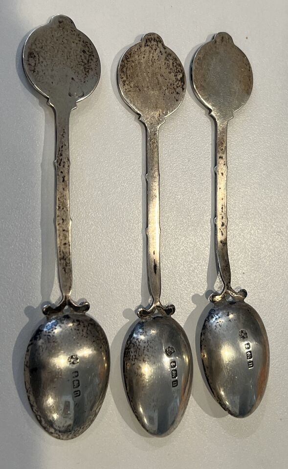 Three lovely floral demitasse collector spoons with porcelain inserts made by Stewart Dawson Co, Limited out of Birmingham England. These spoons are all marked with the same date mark indicating they were made in 1912. See all photos for details.