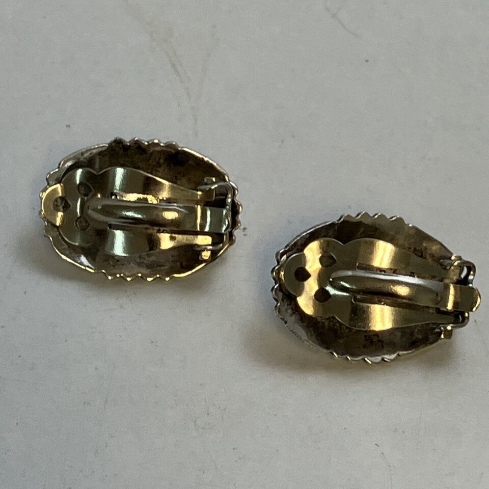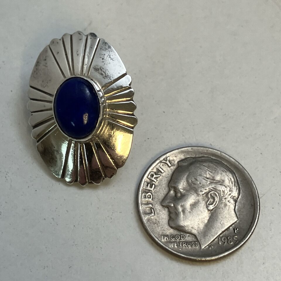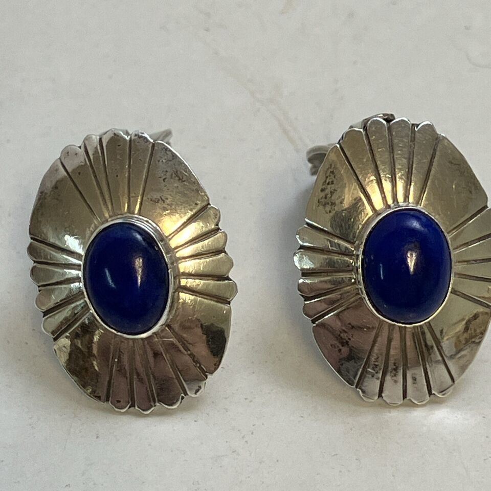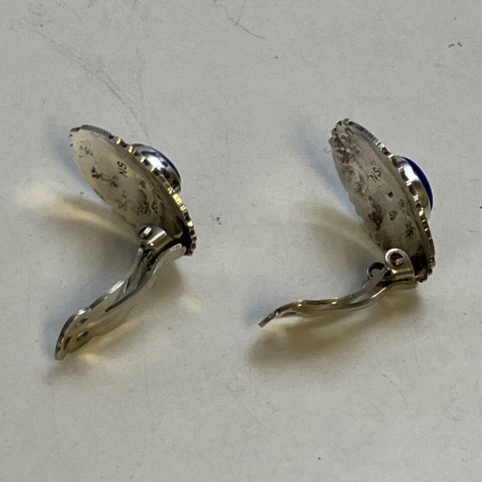 Earrings are clip on and marked STERLING along with maker?s mark. Stone appears to be lapis lazuli (blue).