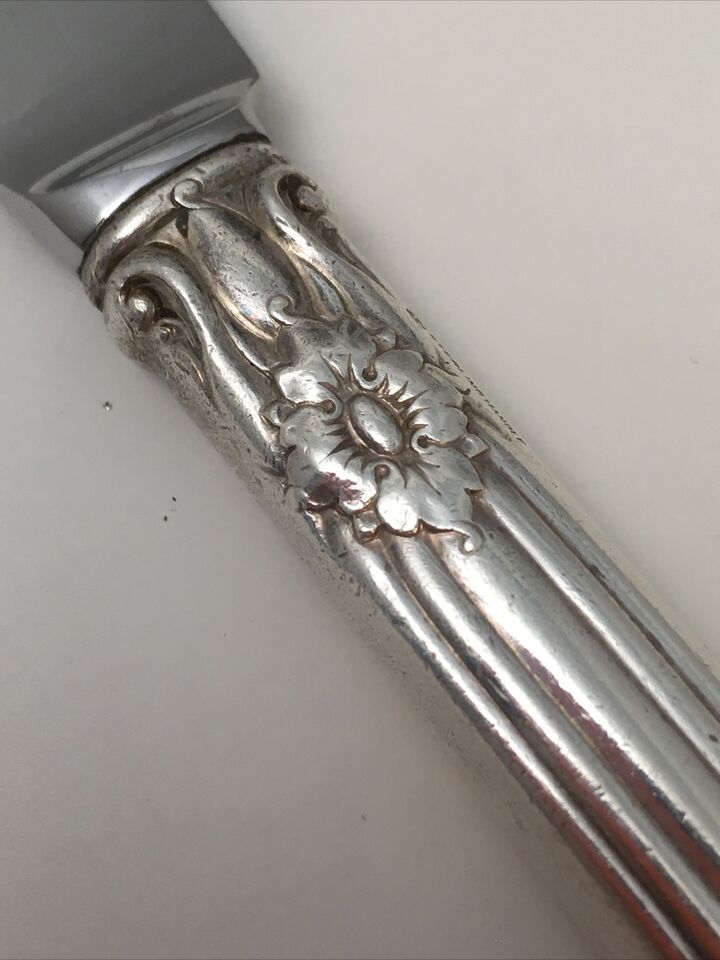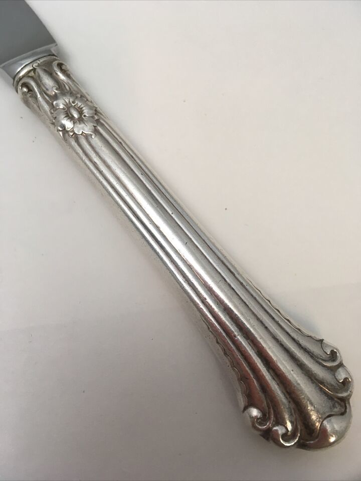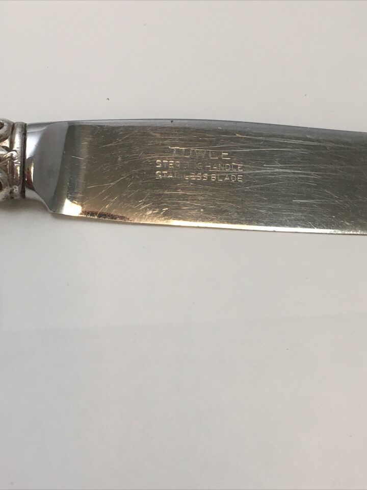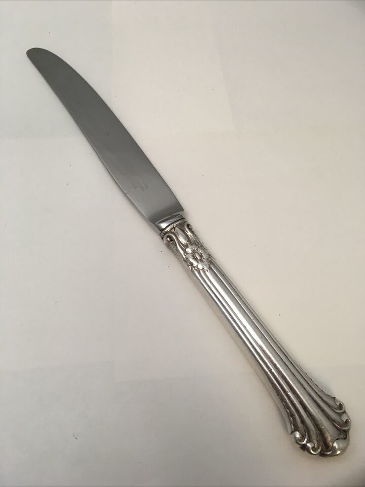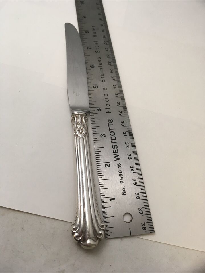 Fairly rare 1939 Towle sterling silver handled dinner knife in Silver Plumes pattern. Knife is 9.5 inches long and blade is stainless steel. There are up to 5 available. You may purchase one or all five and shipping remains the same.