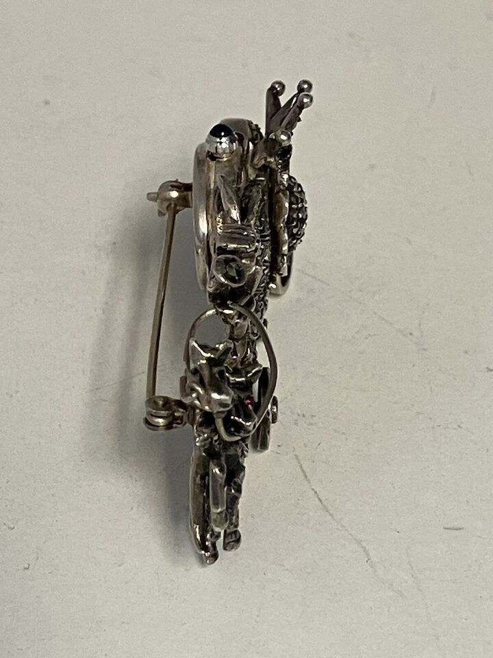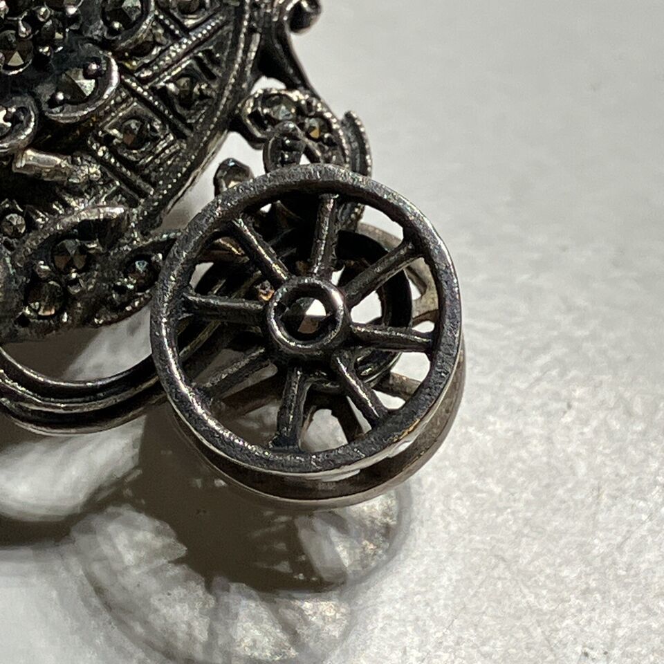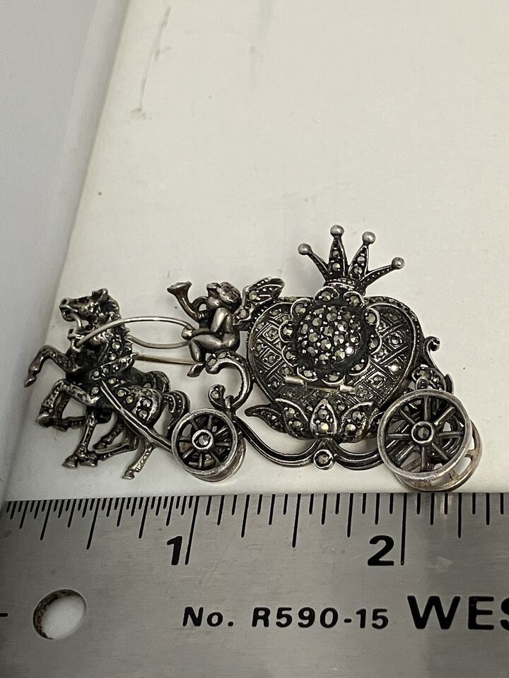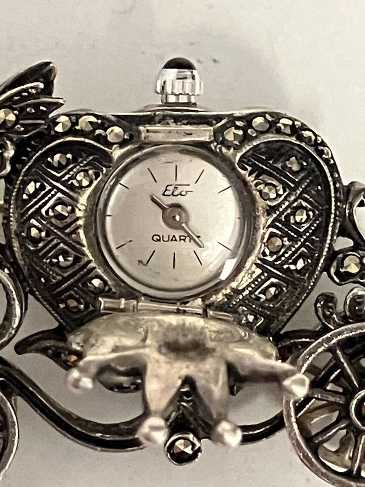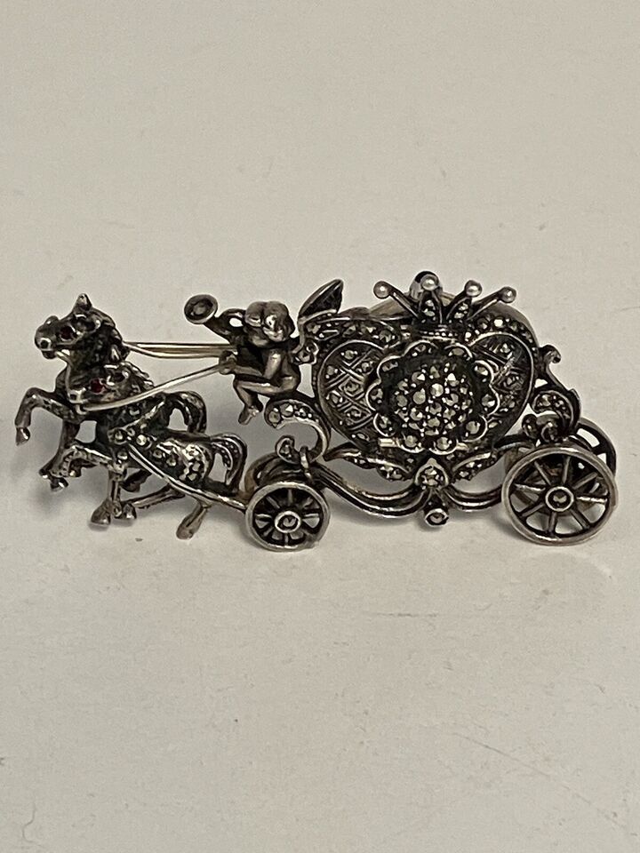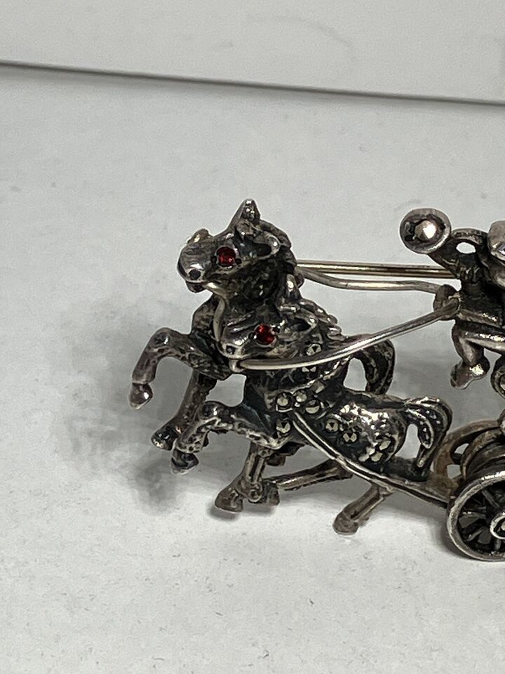 Rare Elo Sterling Silver Marcasite Ruby Eyes Horse & Carriage Watch Brooch Pin