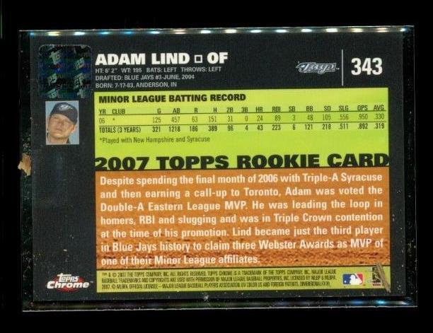 2007 Topps Chrome #343 Adam Lind Rookie Auto RC Blue Jays Baseball Card