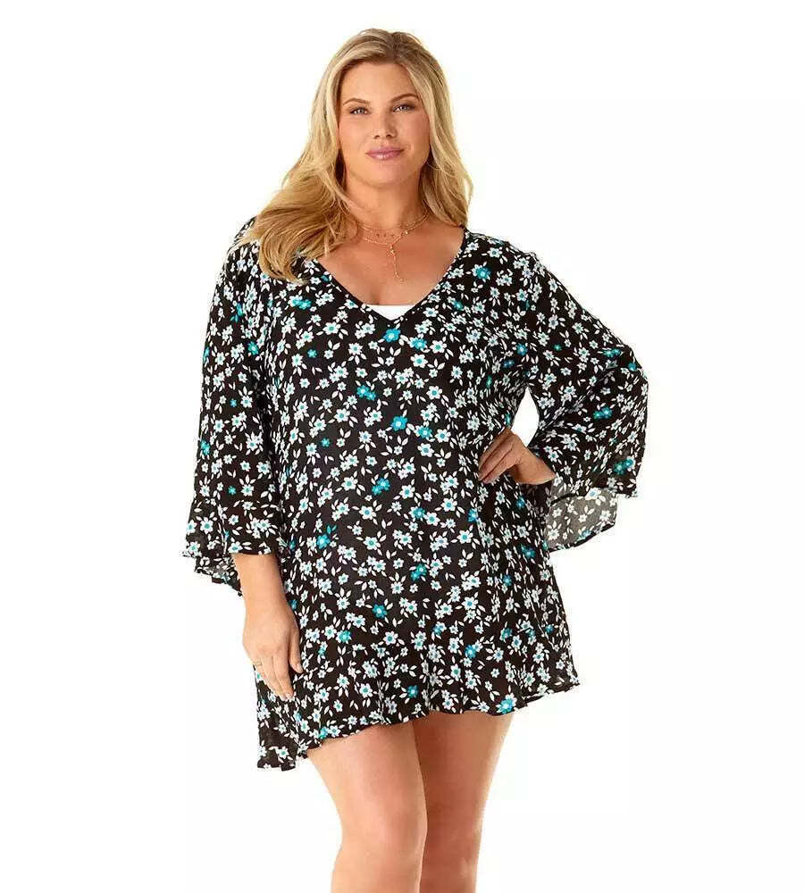 Anne Cole Plus - Flounce V Neck Tunic Fabric Content: 100% Crinkle Rayon Flounce Tunic Dress Sunset Floral Print Tunic V-Neck Beachwear