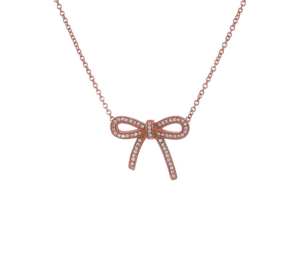 Stainless Steel Polished Rose IP-plated Crystal Bow w/1.75in ext Necklace