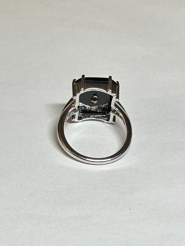 Features a prong-set, emerald buff top-cut genuine black onyx gemstone (measures 16mm x 12mm)