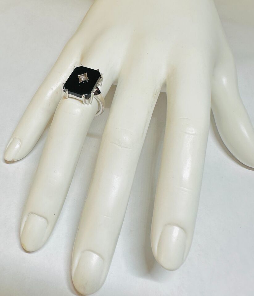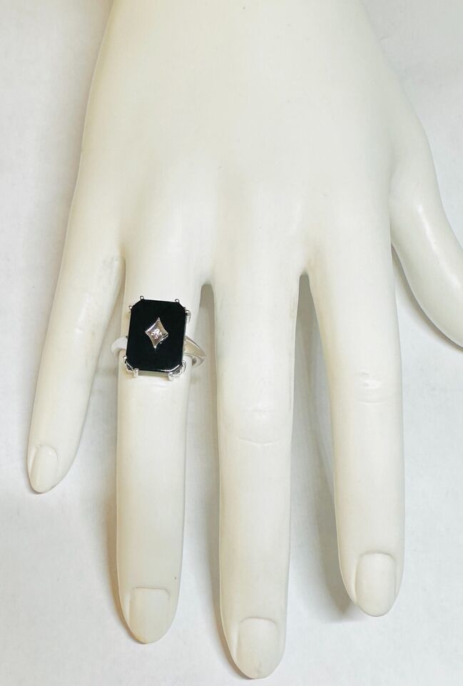 Vintage NOS 1970's Sterling Silver 14K White Gold Genuine Diamond Rhomboid and Black Onyx Ladies Ring