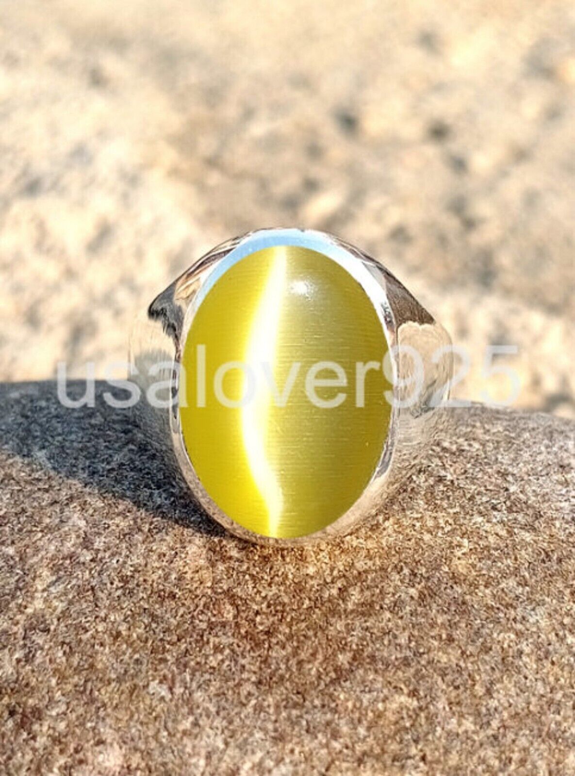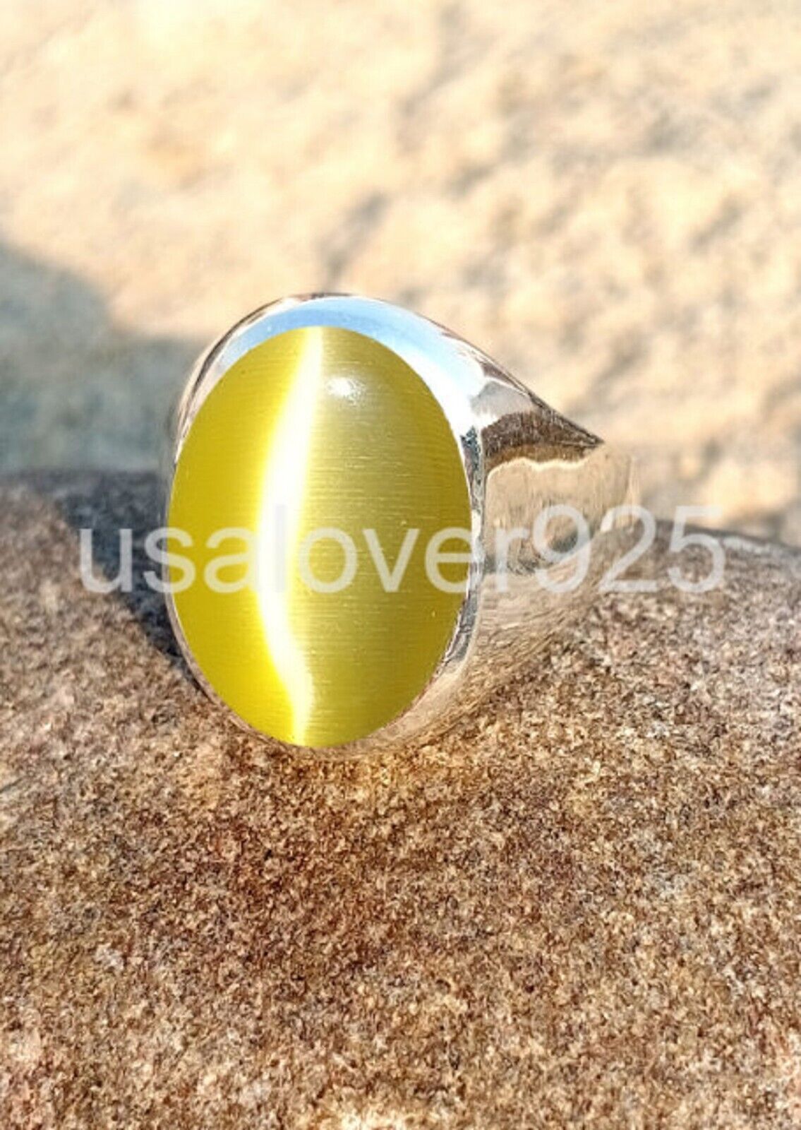 Yellow Cats Eye Chrysoberyl Gemstone White Brass Handmade Men Ring Jewelry