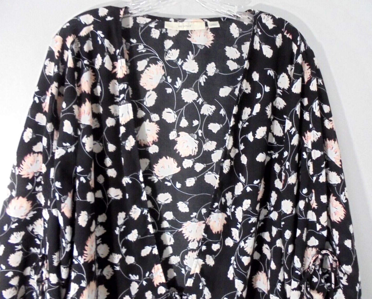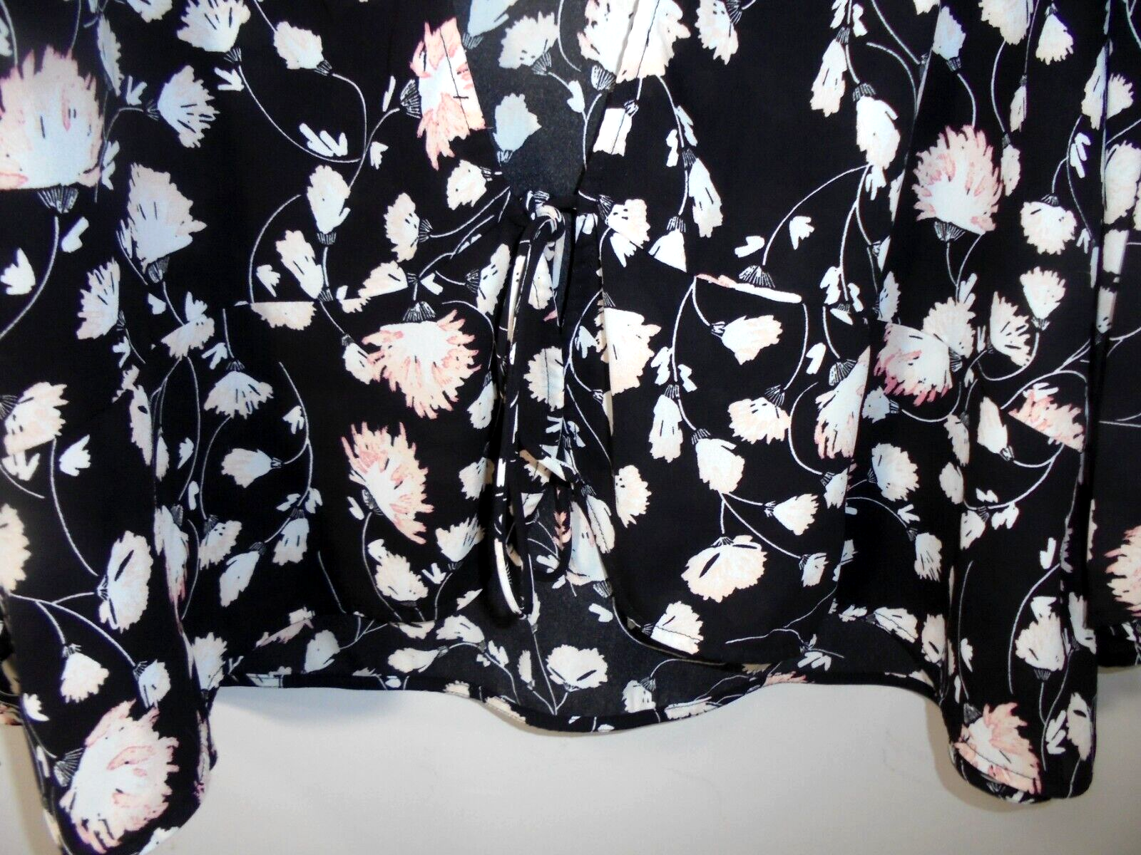 Description: Lovely flowy kimono with pretty floral print. Tie closure on bottom, ties on sleeves. Flared long sleeves.