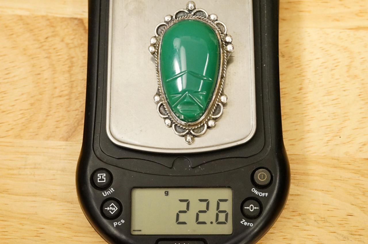 VINTAGE Jewelry 925 Silver Taxco Mexico Aztec Green Onyx Tribal Mask Brooch Pin - measures 2.25" long. Signed on the back.