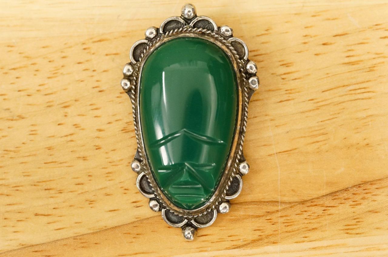 VINTAGE Jewelry 925 Silver Taxco Mexico Aztec Green Onyx Tribal Mask Brooch Pin