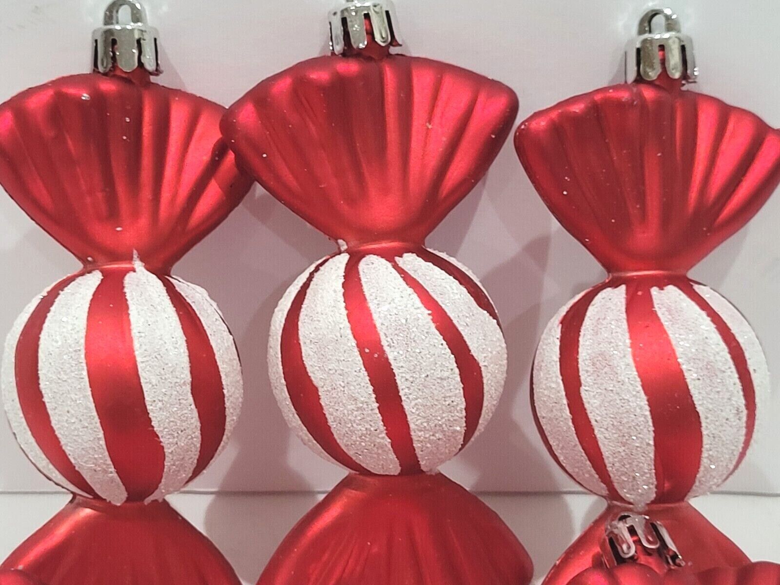 Up for sale we have a set of (6) adorable plastic peppermint candy ornaments for your Christmas tree, Wreath or Garland. These ornaments are so cute they are red with white glitter. Some might have small scratches. These measure approx 4.5" including the silver tip. I have many other ornaments that would look great with these (see last pictures 5 through 8) for just some of the other styles I have. so check out my store.