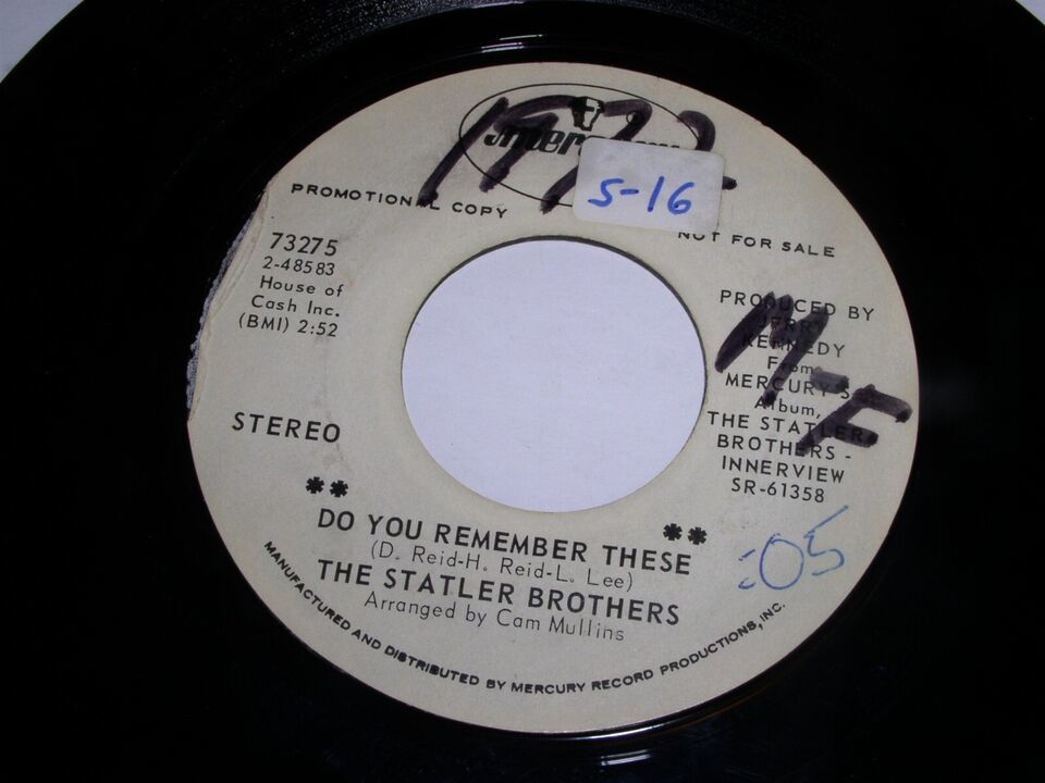 This is an original, vintage, promotional 45 rpm phonograph record by The Statler Brothers entitled, "Do You Remember These". Flipside: "Since Then". Record label Mercury 73275.