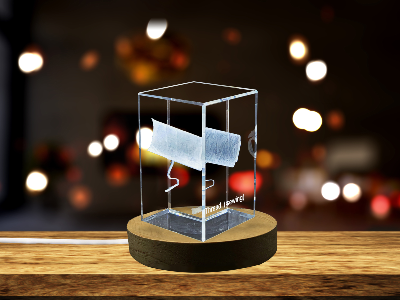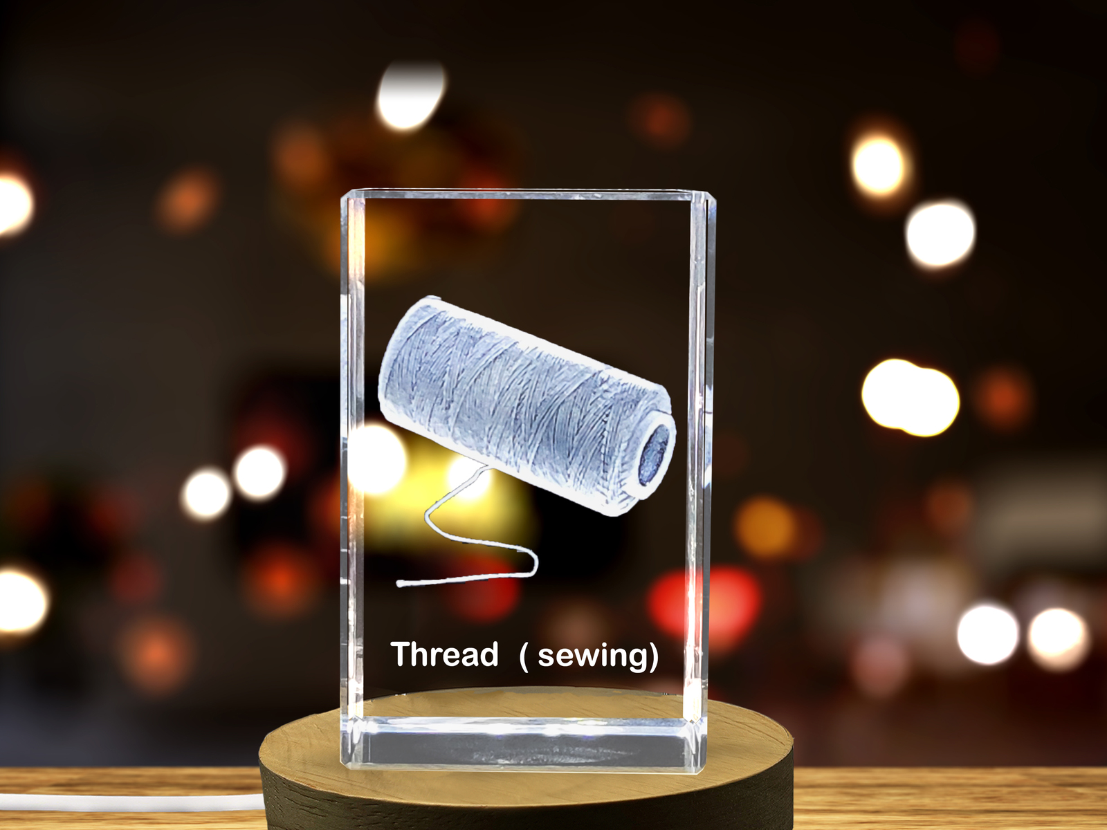 Behold this exquisite crystal sculpture of intricately engraved sewing thread loosely coiled around an antique spool. A skilled artisan has painstakingly recreated the individual filament strands and their soft texture at microscopic scale.