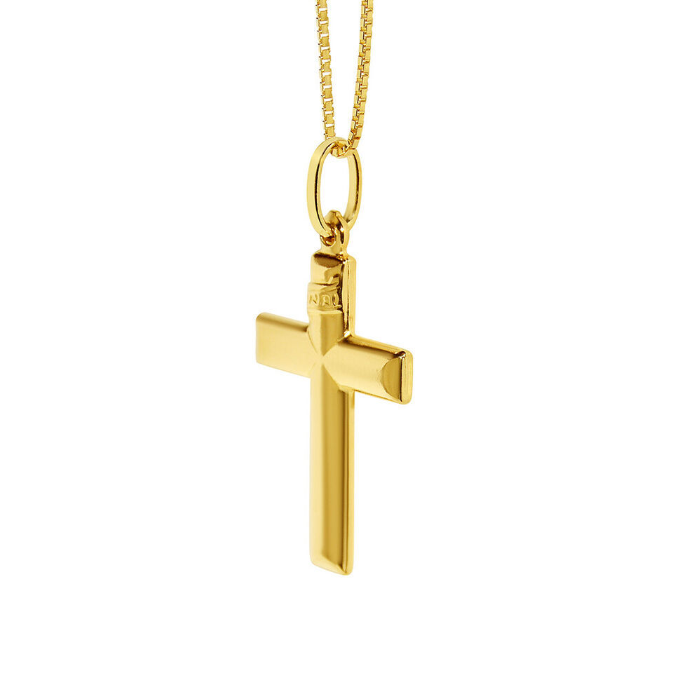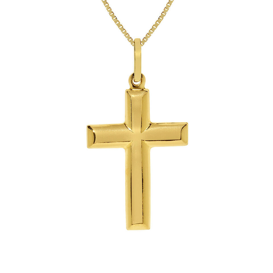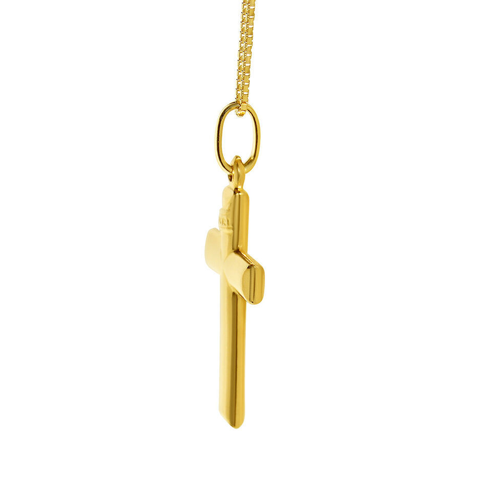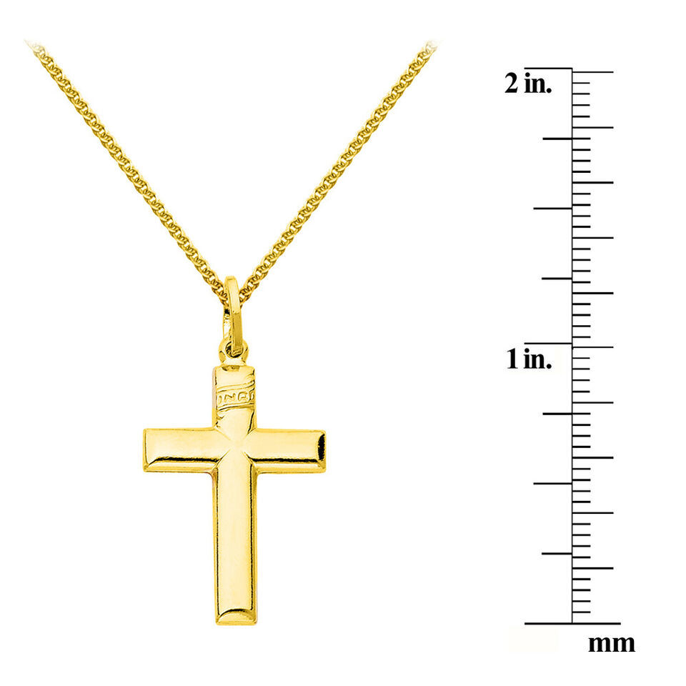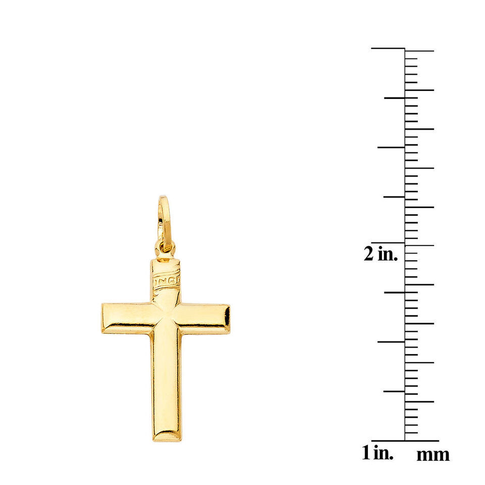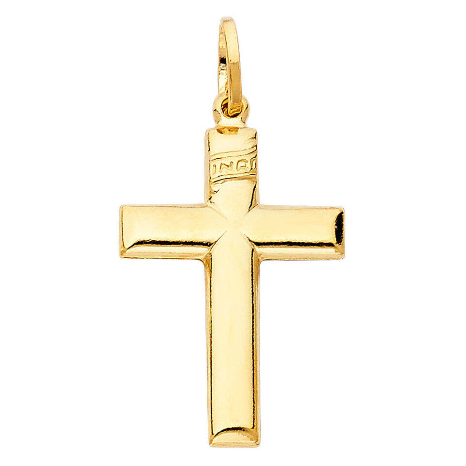 Adorn yourself with a symbol of faith through this enchanting cross pendant, meticulously crafted from 14k yellow gold. Its flattened design showcases the inscription ?INRI? at the top, a poignant reminder of Christian heritage. The pendant, pristine in its highly polished finish, measures approximately 1.18 inches in length, making it a subtle yet striking addition to any ensemble.