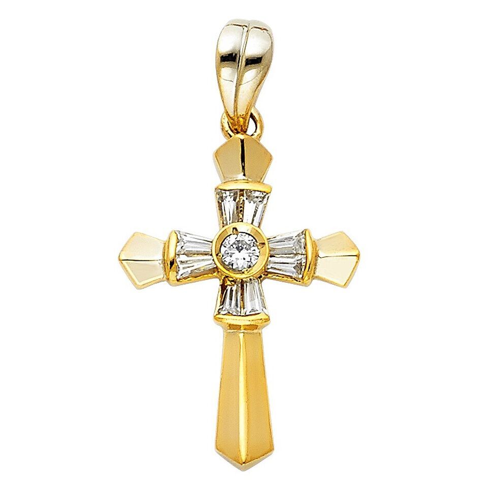 This cross-shaped pendant, expertly crafted from smooth 14-karat yellow gold, showcases a stunning round cubic zirconia at its center. Surrounding this central stone are sparkling baguette cubic zirconia, adding a touch of brilliance to the overall design. This lightweight pendant is engineered with a hollow back to ensure comfort for everyday wear. The dimensions measure 0.90 inches in length, with a width of 17 mm and a length of 23 mm, making it a delicate yet eye-catching piece.