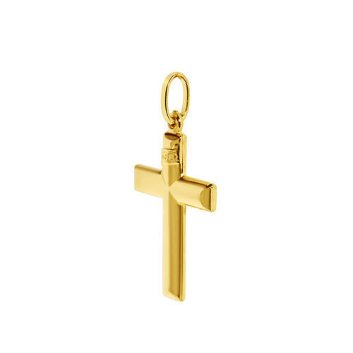 This traditional-style cross pendant is elegantly crafted from 14k yellow gold, showcasing timeless design and quality. Its flattened form features 'INRI' engraved at the top, symbolizing its significance. The pendant is expertly finished with a highly polished surface, enhancing its classic appeal. Measuring approximately 1.18 inches in length, it offers a striking yet understated presence, making it a versatile piece for various occasions.