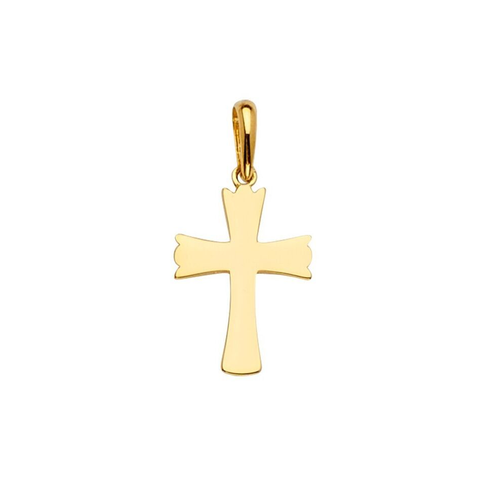 This 14k yellow gold cross religious charm pendant offers a sophisticated addition to any casual wardrobe. Crafted from high-quality 14k yellow gold, it showcases an elegant flat design that features flared edges and a highly polished surface. Measuring 12 mm in width and 24 mm in length, this pendant strikes a perfect balance between subtlety and presence. Weighing approximately 0.7 grams, it is both lightweight and comfortable for daily wear.