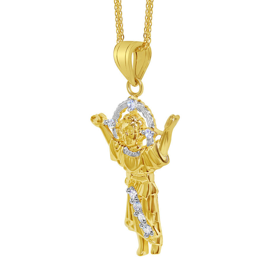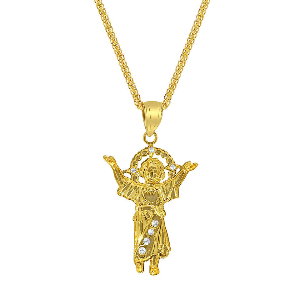 Celebrated among the Christian community, this enchanting pendant captures the essence of the Divine Baby Jesus, also lovingly referred to as Divino Niรฑo. It serves as a touching symbol for those wishing to embody the purity and spirit of the infant Jesus. Crafted from luxurious 14-karat yellow gold, this pendant glimmers with prong-set cubic zirconia, measuring approximately 11/16 inch in length.