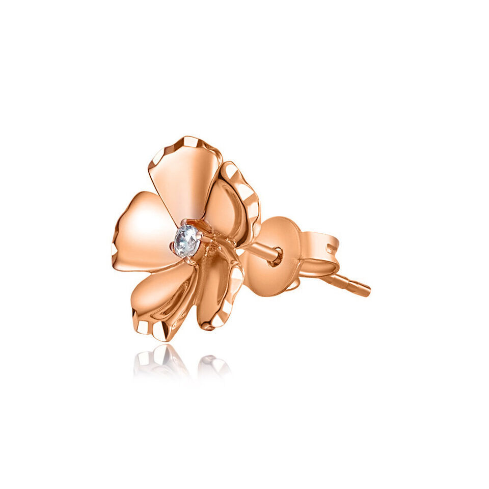 These stud earrings are expertly crafted from 14-karat rose gold, showcasing a harmonious blend of polished and satin finishes. With a diameter of 9 mm, the classic flower design is both elegant and timeless. At the heart of each earring lies a stunning single round-cut cubic zirconia, delicately set in a micro-prong setting, which adds a touch of brilliance and sophistication to the overall look.