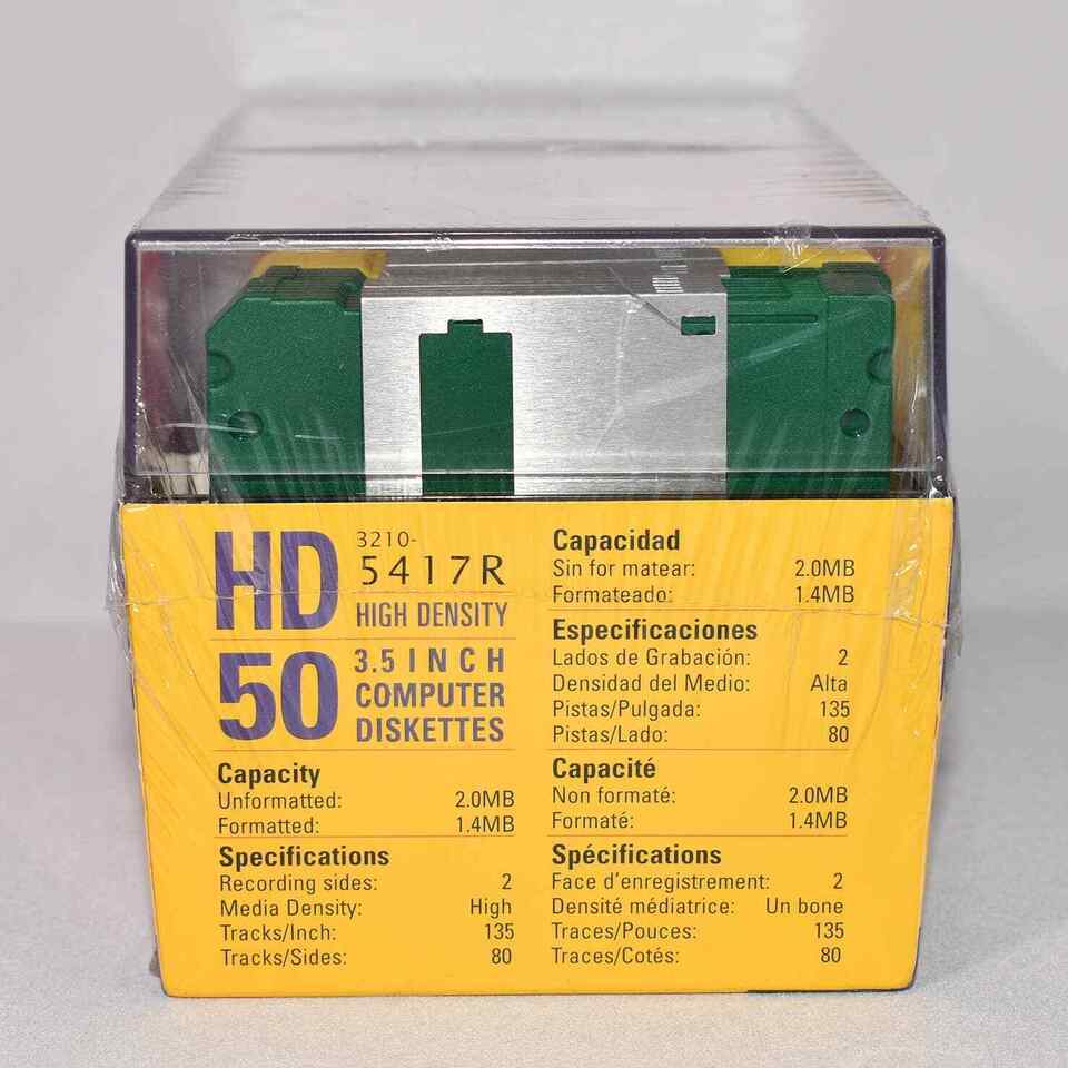 For sale is this 50 pack of 3.5" computer disks with storage box. These disks are in rainbow colors. This set is brand new but the UPC has been cut out and the plastic is torn in some spots. There is a stress crack or 2 in the lid of the plastic storage box. The one I saw is less than a dime in size.
