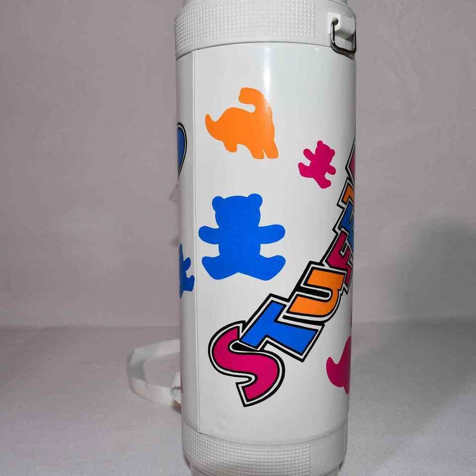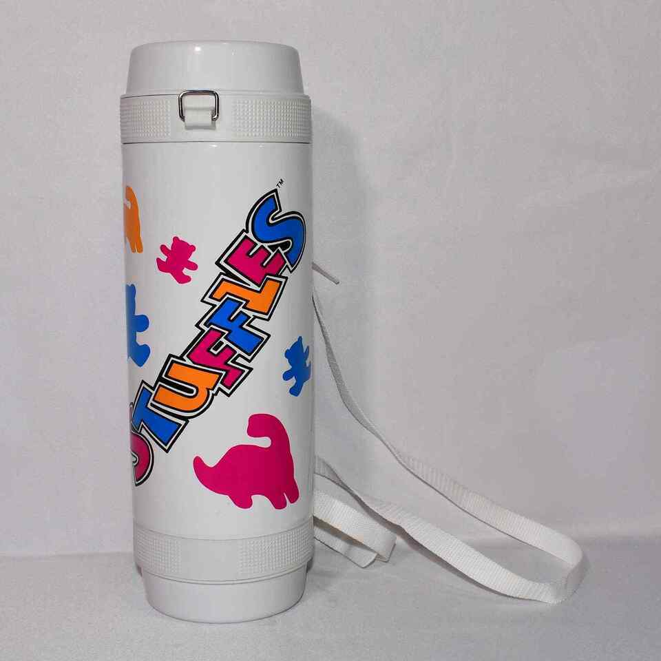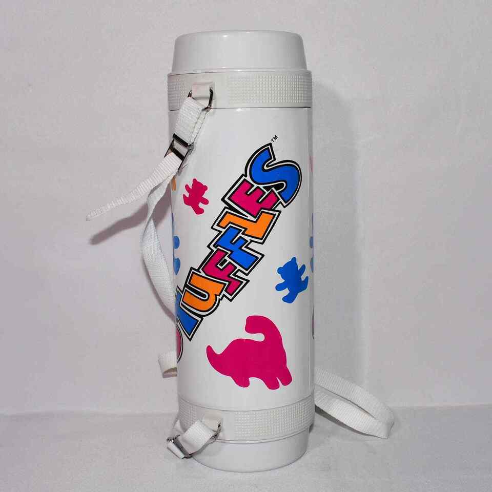 This great looking Mikasa Hot / Cold Thermos has a vintage look to it. Featuring the word Stuffles on the sides and animals of different size and color. This looks to be a great piece and has a few pink stains on one side and a soft dent on the outside that is barely noticeable unless you were looking for it.