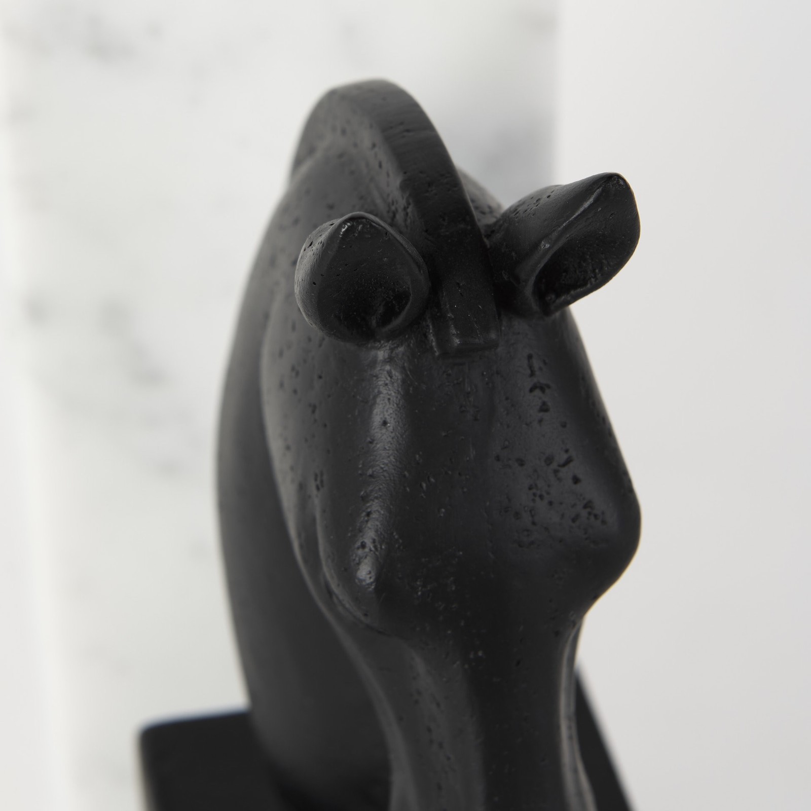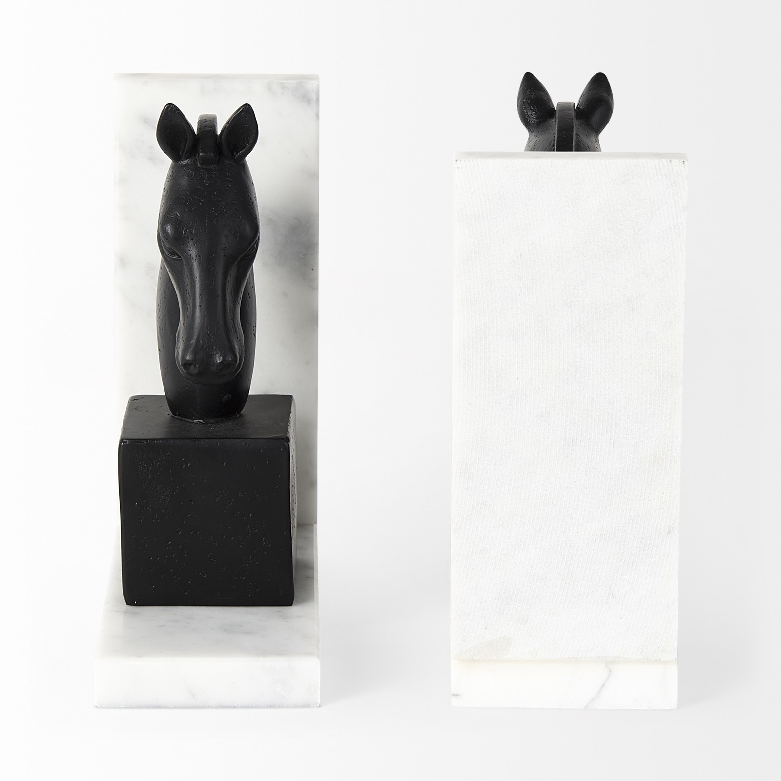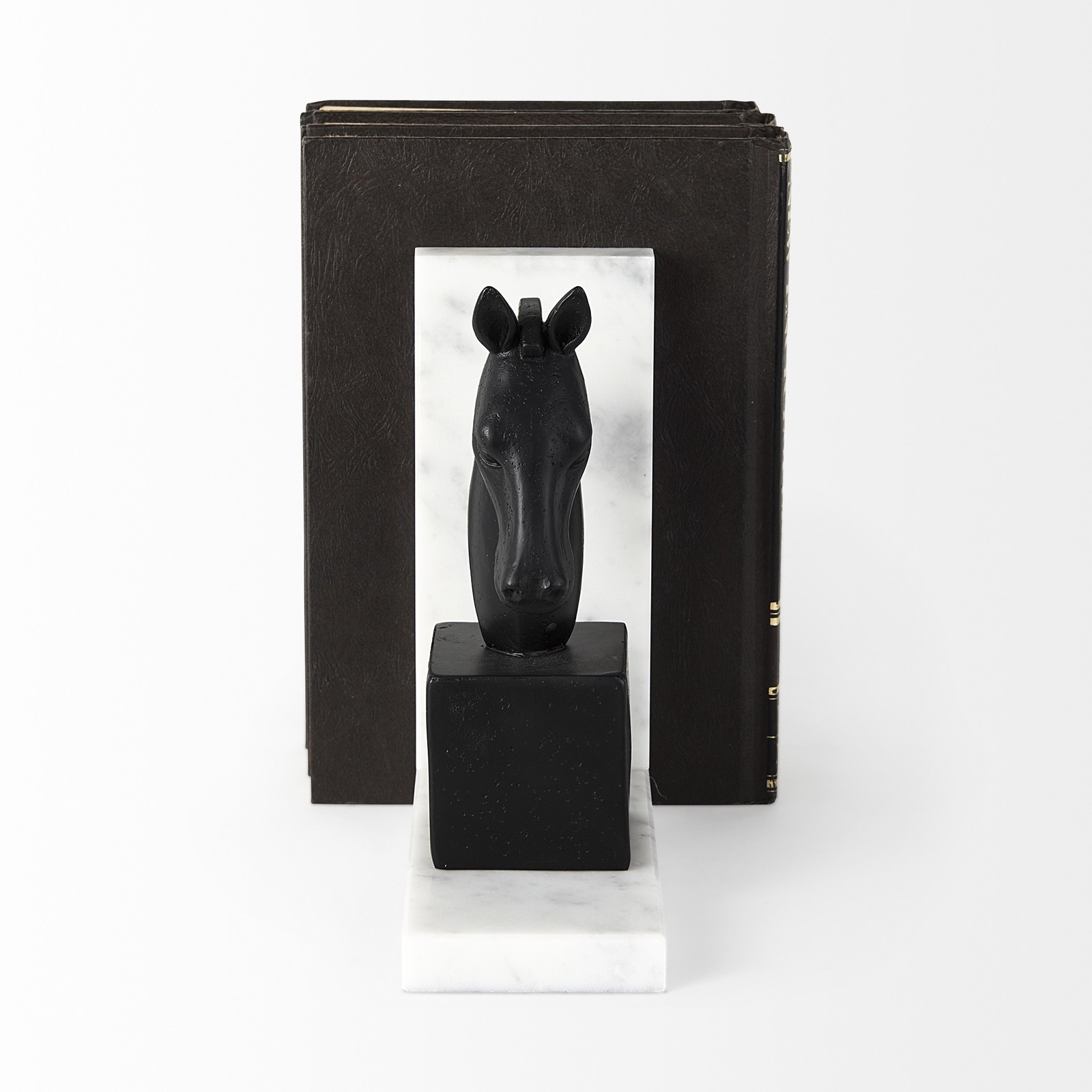 Unique and magestic, add a fun yet elegant touch to your bookshelf with these Black Stallion on White Marble Bookends. These bookends are made from resin and marble which makes them sturdy and durable enough to hold as many books as you want without slipping or moving around. The bookends are shaped like a stallion finished in a distressed matte black that then sits atop a marble base. You can use these bookends to display your books or you can use them as stand-alone decor pieces as well. The uses of these bookends are versatile and they also make great gifts for both friends and family. 8.2" H x 3.1" W x 14.3" D