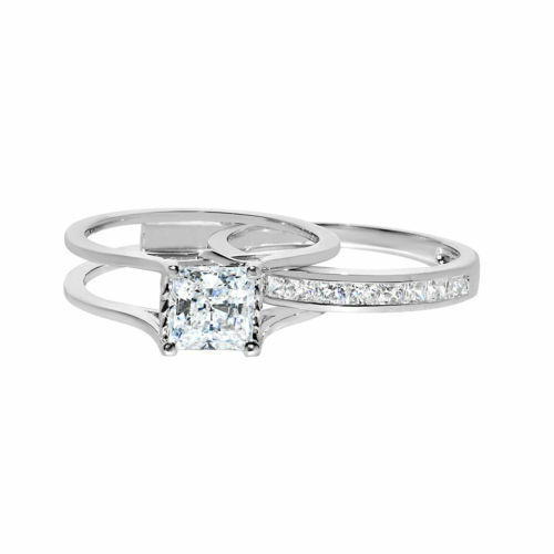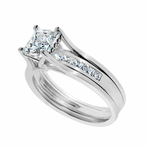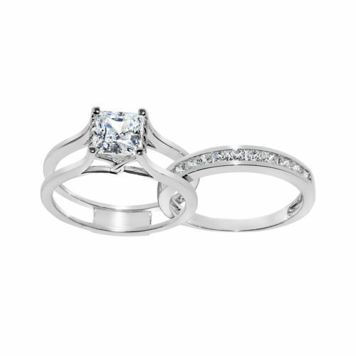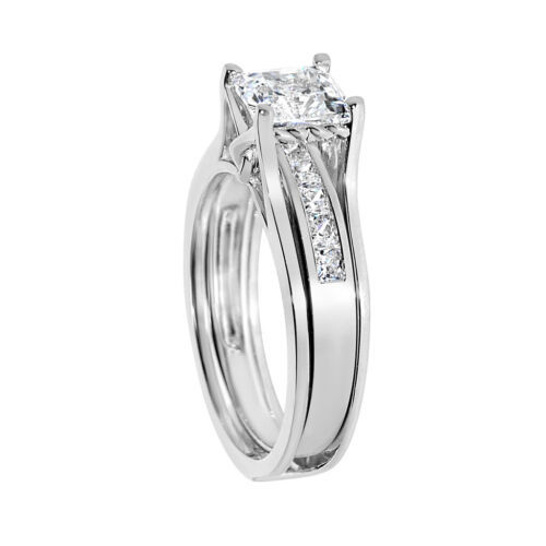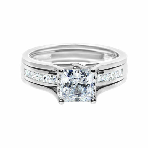This exquisite wedding set seamlessly blends elegance and functionality, offering the charm of a solitaire with the added beauty of a princess-cut insert engagement ring. Crafted in 14k white solid gold, the ring showcases a brilliant setting of pave-set princess-cut Diamonette - Diamond Simulant stones. These dazzling stones, equivalent in carat weight to 1.75 carats of natural diamonds, lend an air of luxurious sophistication.