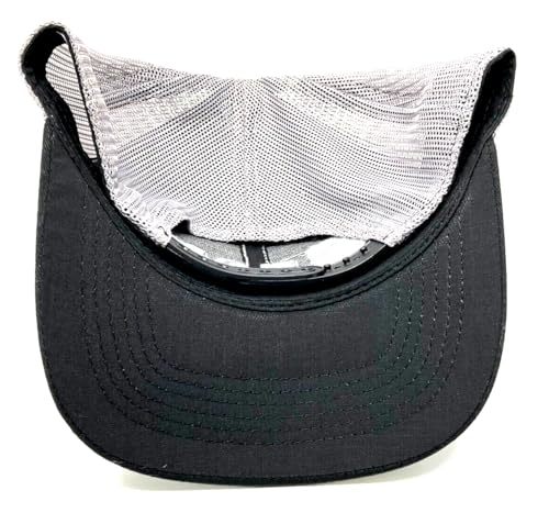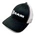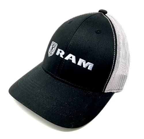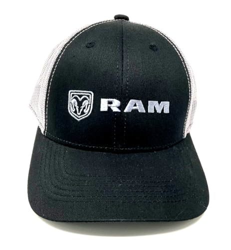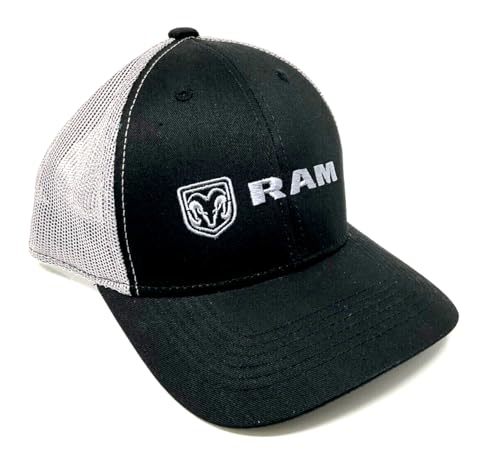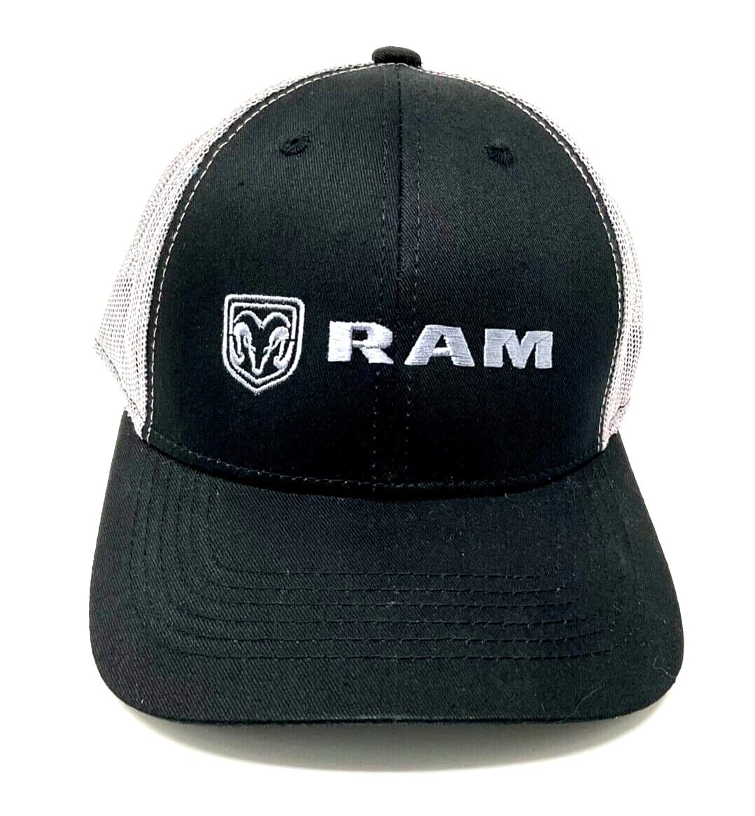 RAM Logo Black Grey Mesh Trucker Curved Bill Adjustable Snapback Hat. Cap design features a RAM Logo Text embroidered on the front black 2 panels of a curved bill trucker hat with white mesh backing. Adjustable snapback closure makes this a One Size Fits Most Hat.