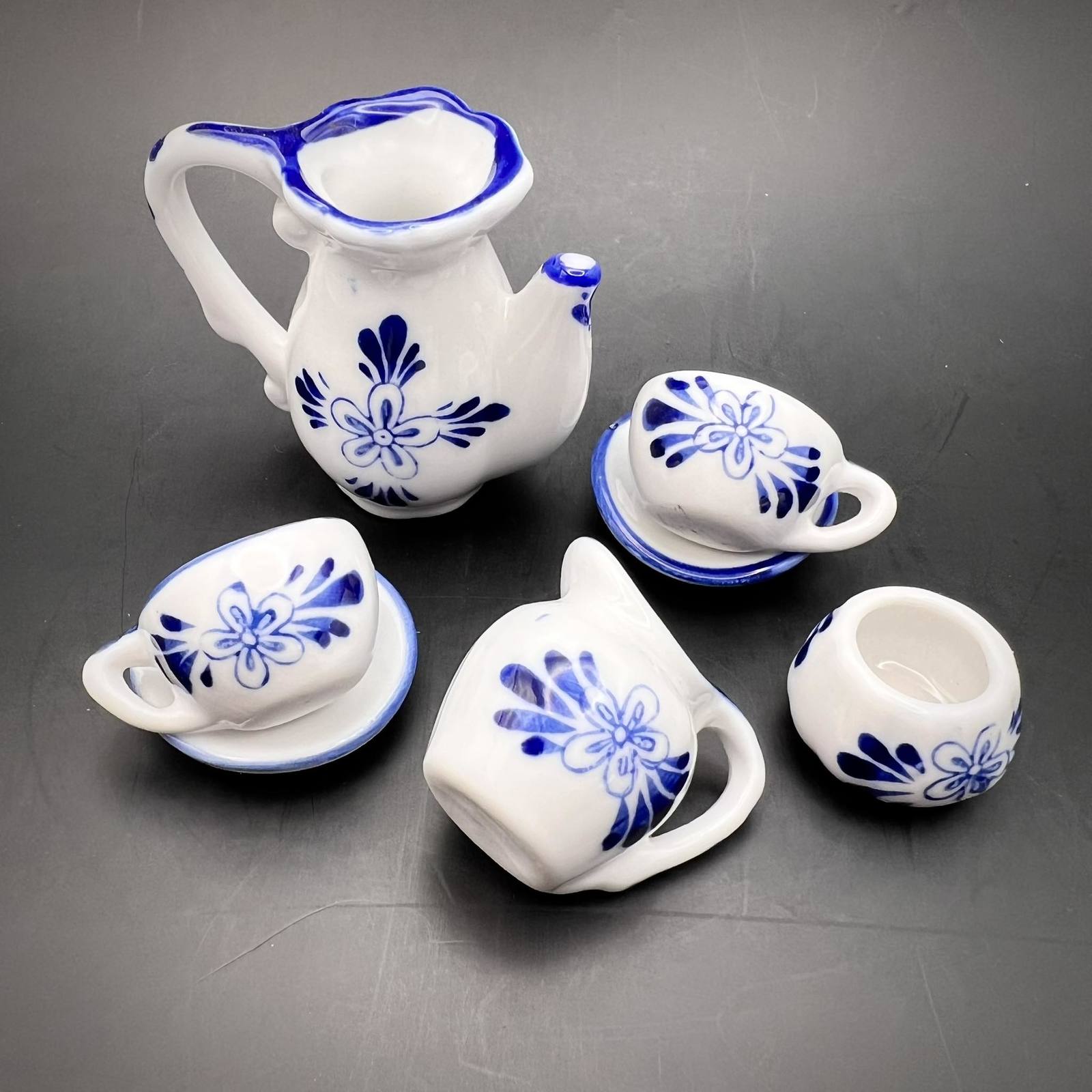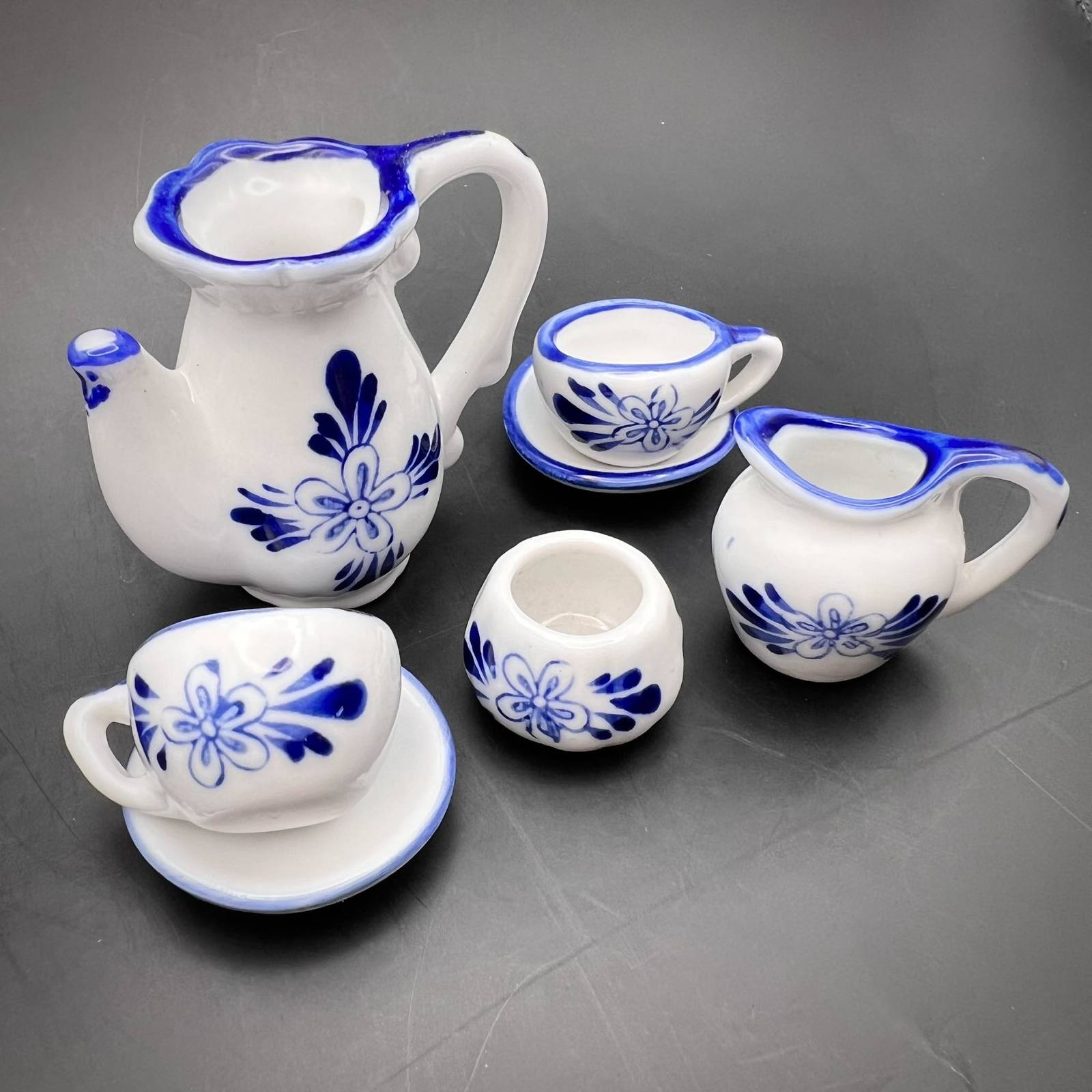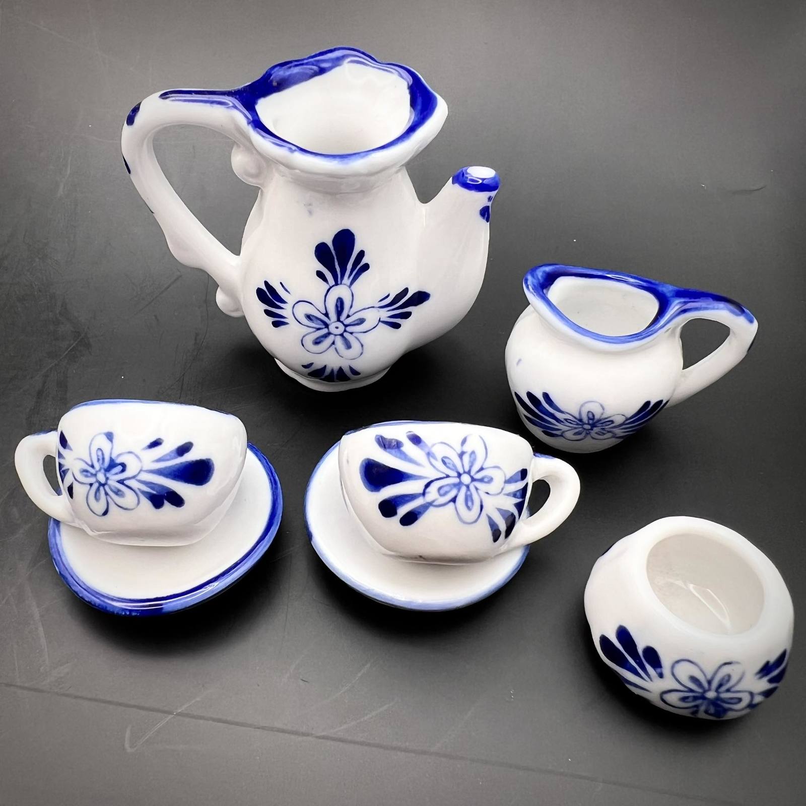 Miniature Figure Tea Coffee Set Hand Painted GZHEL Cobalt Ceramic Souvenir