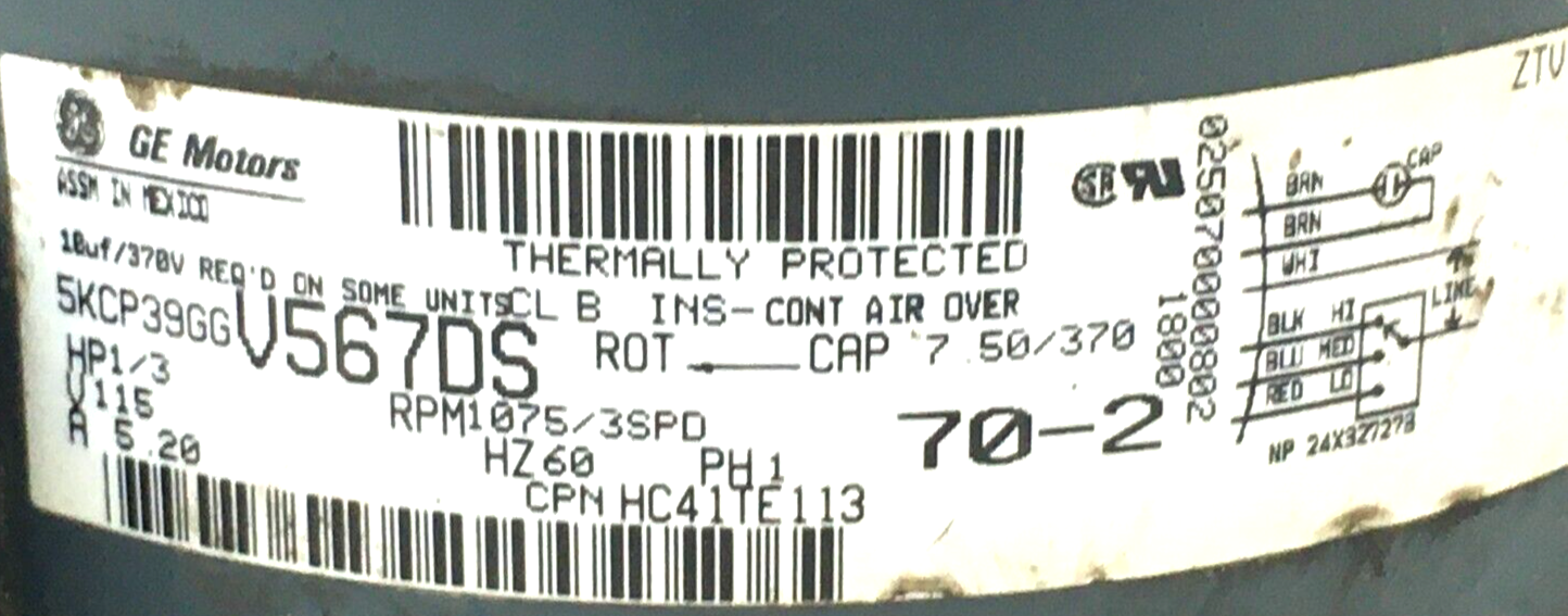 GE Motors 5KCP39GGV567DS Blower Motor 1/3HP 1075RPM 3SPD 115V HC41TE113 #MC623