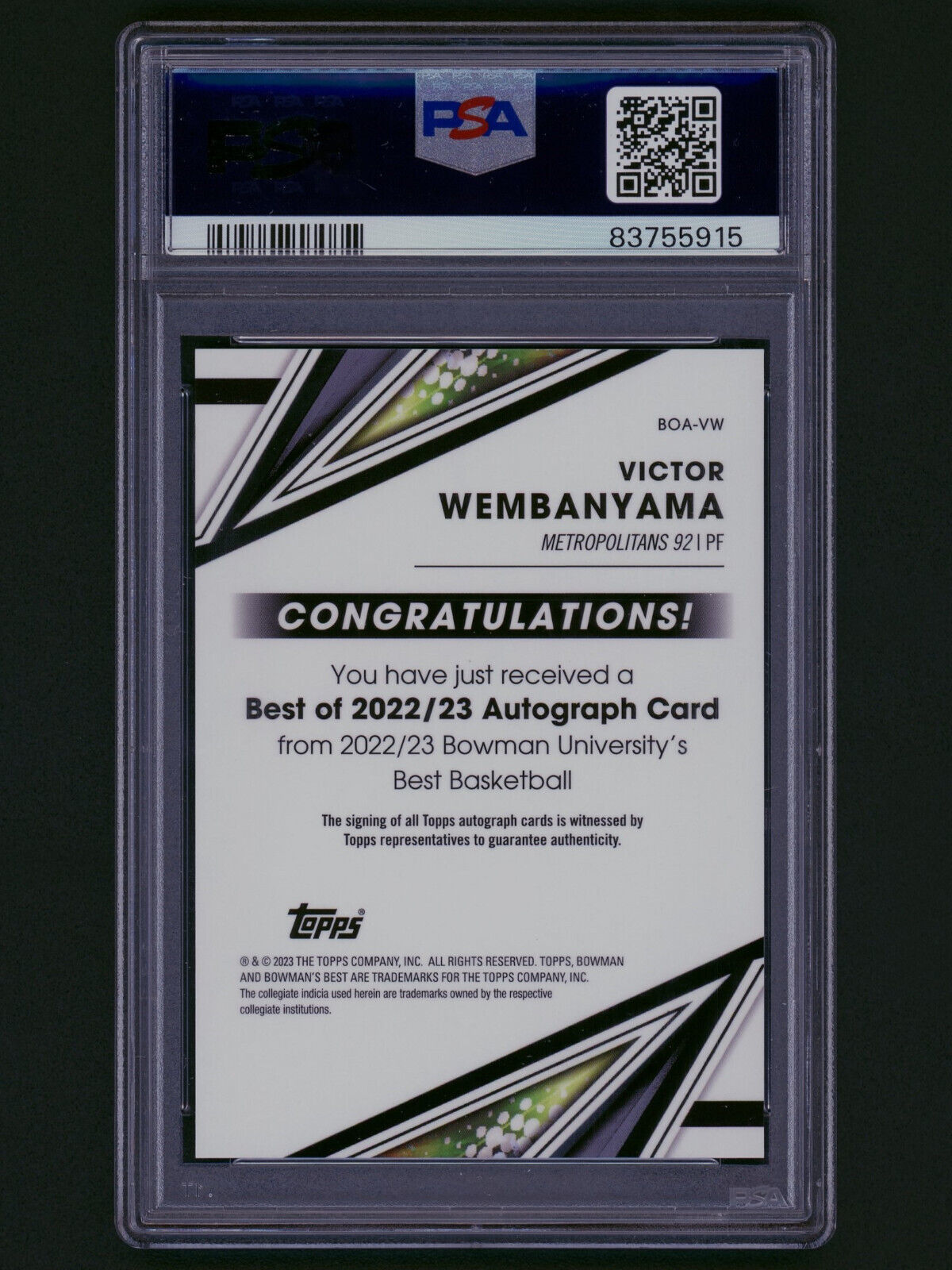 2022 Bowman's Best Victor Wembanyama Rookie Autograph Card PSA Mint 9 Mets 92