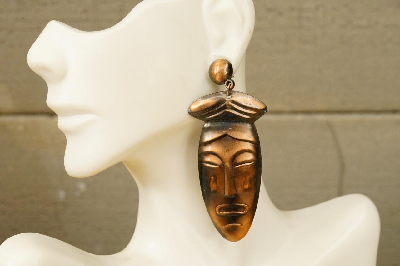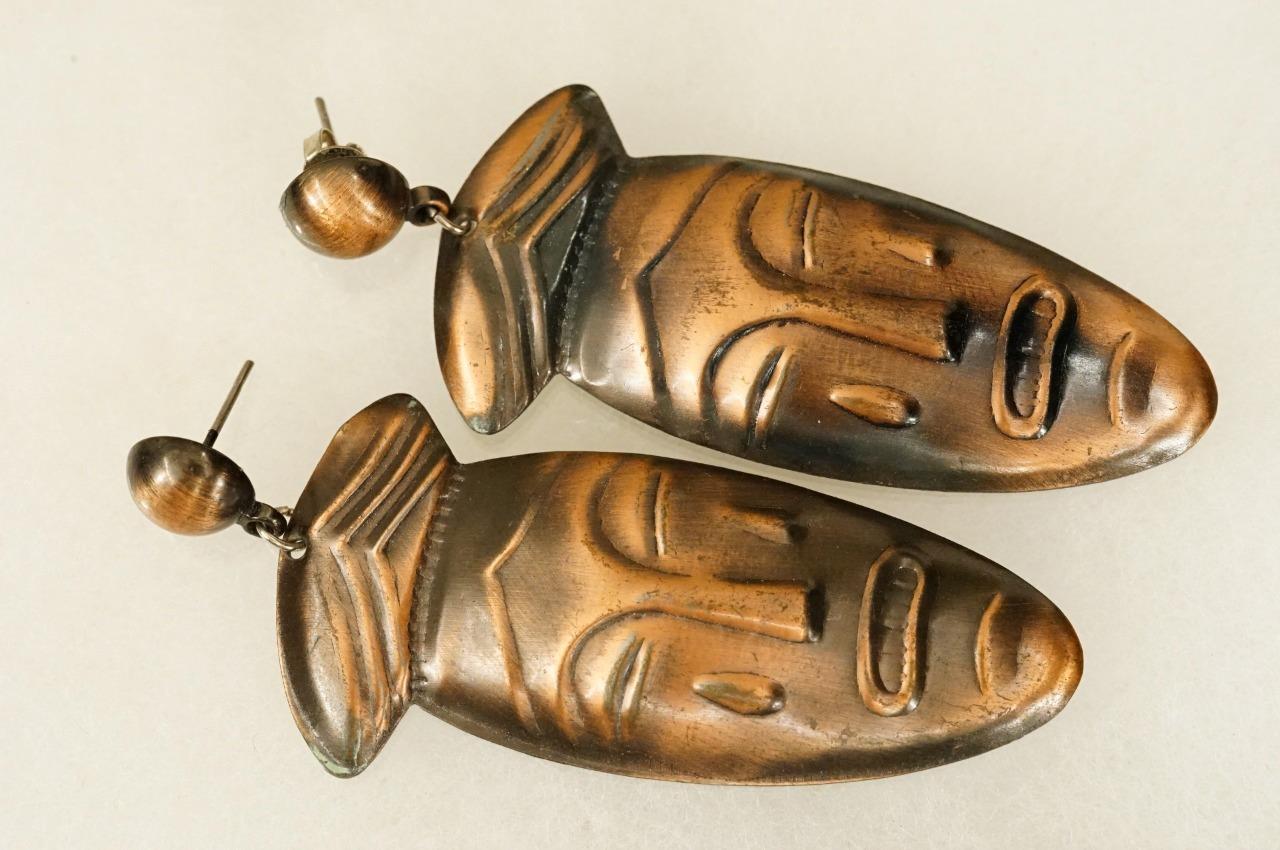 Vintage MCM Archetype Copper Tone Metal Tribal Mask Pierced Dangle Earrings. They measure3" long. Stamped raised relief style. Please pay close attention to the measurements. Mannequin is not life size.