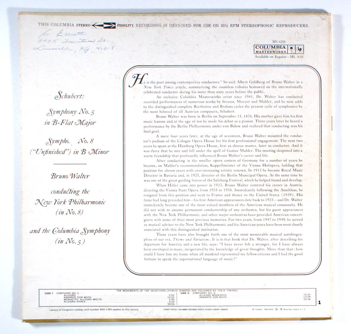 Bruno Walter - Symphony No. 8 / Symphony No. 5 (1960) Vinyl LP โข Schubert