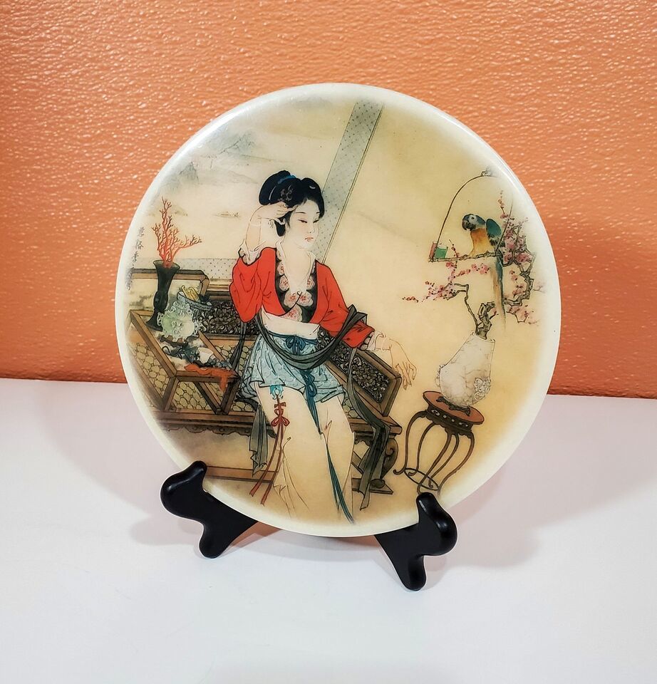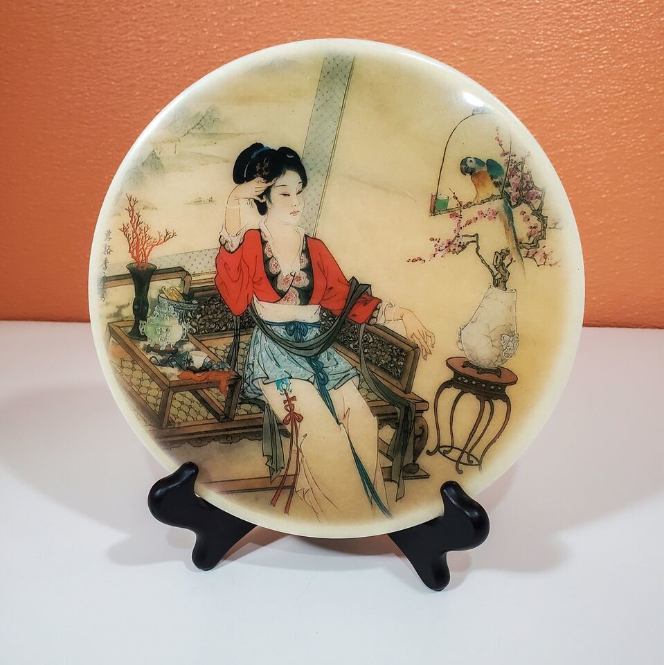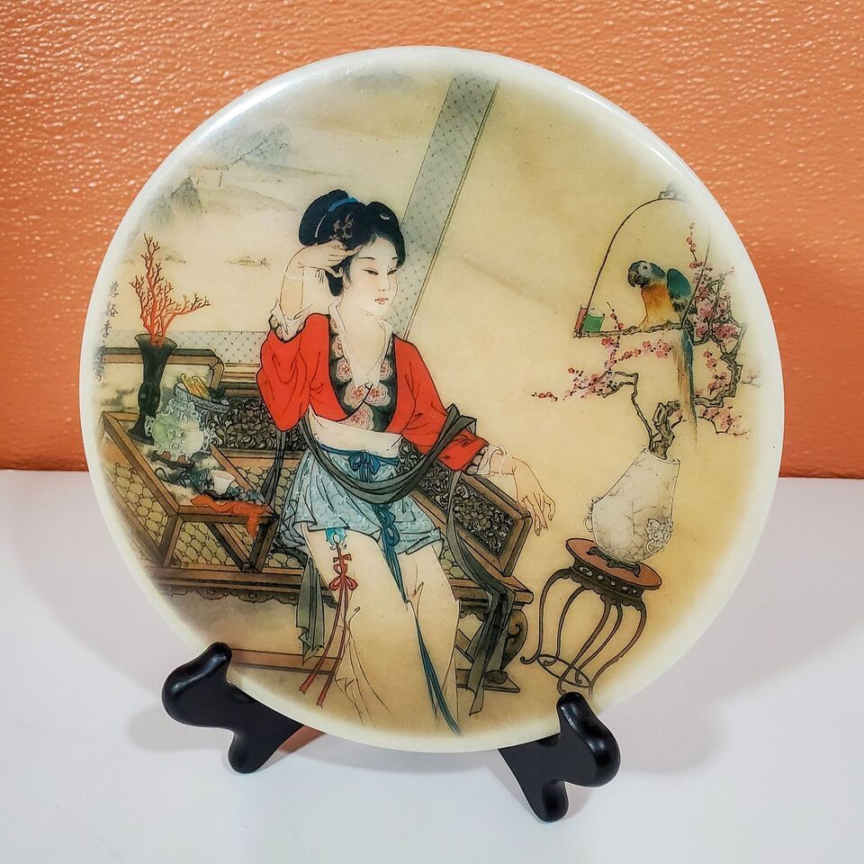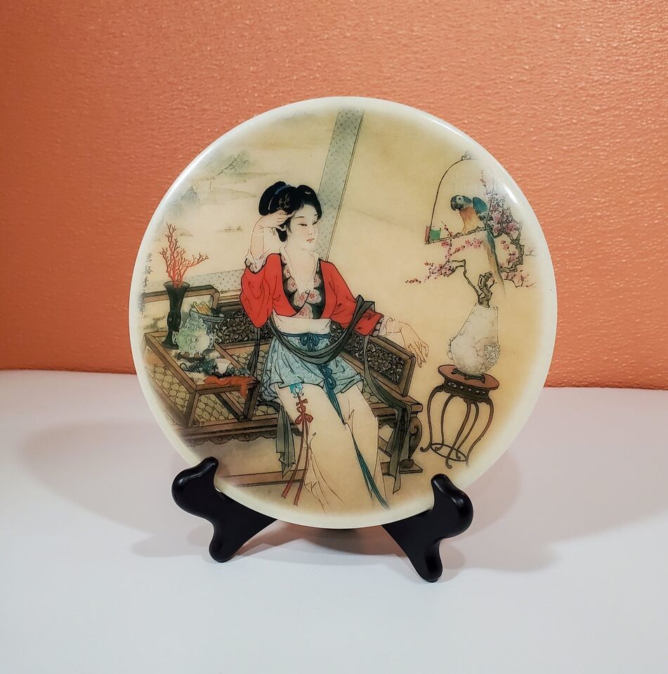 Vintage Hand-Painted Geisha Stone Plate with Wooden Stand | Home Decor Plate 8?
