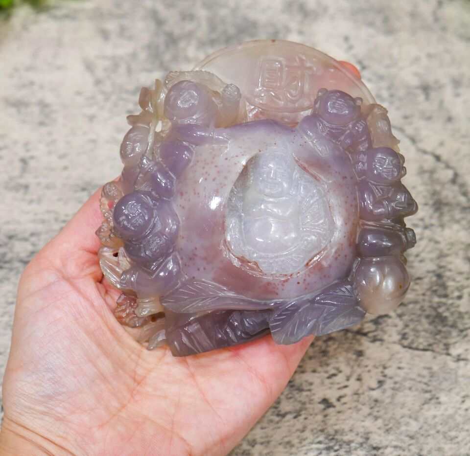 Chinese Agate Quartz Carved Happy Fertility Buddha On Stand - Rare Sculpture