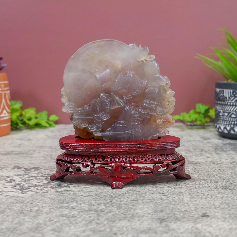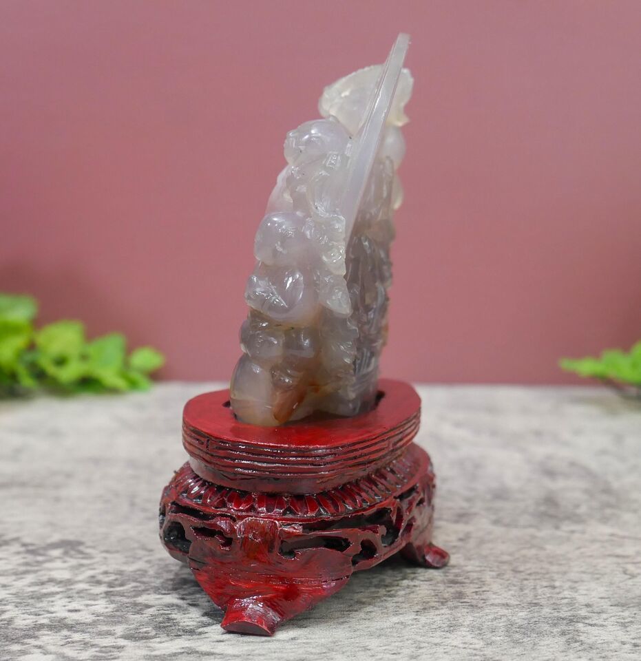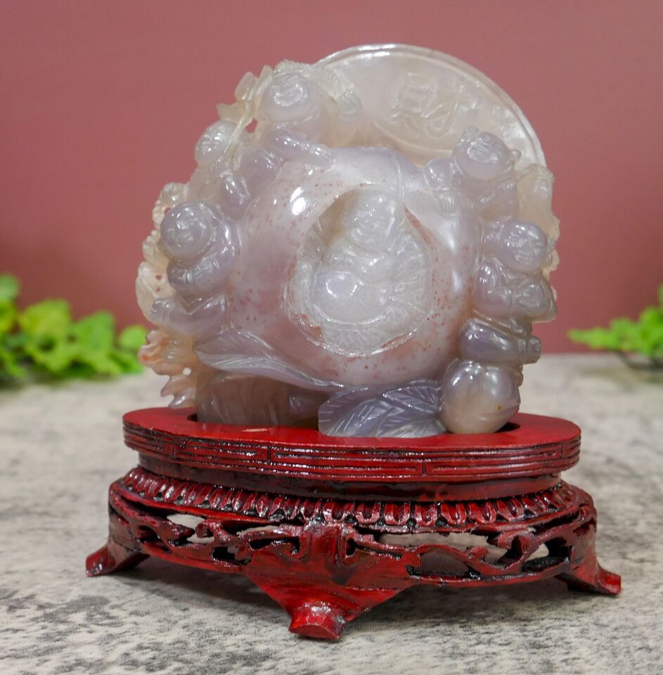 Exquisite Vintage Chinese Agate Quartz Carved Happy Fertility Buddha Statue Sculpture. Feng Shui Buddha depicted along with 5 Children. A Very Rare Sculpture, Amazing Intricate Detail, Remarkable Condition, On A Wooden Stand (stand does has a slight blemish on it ? visible in images).