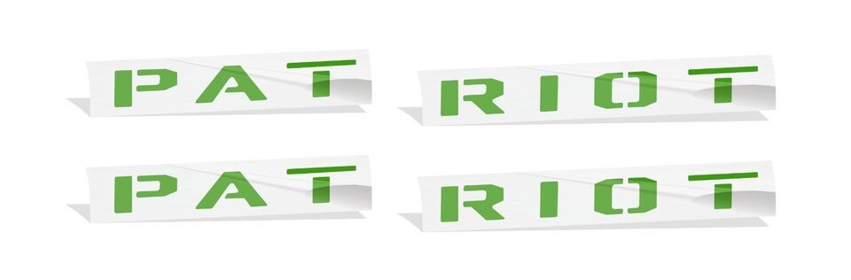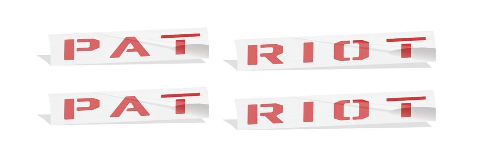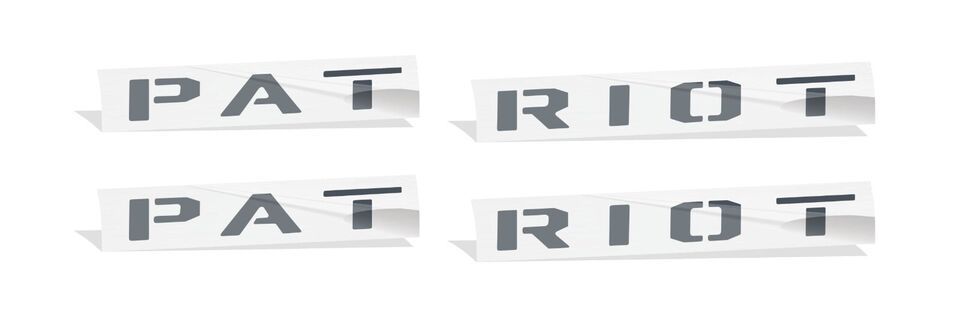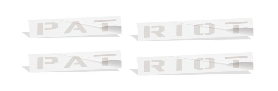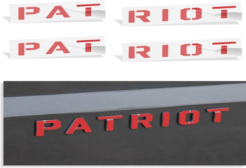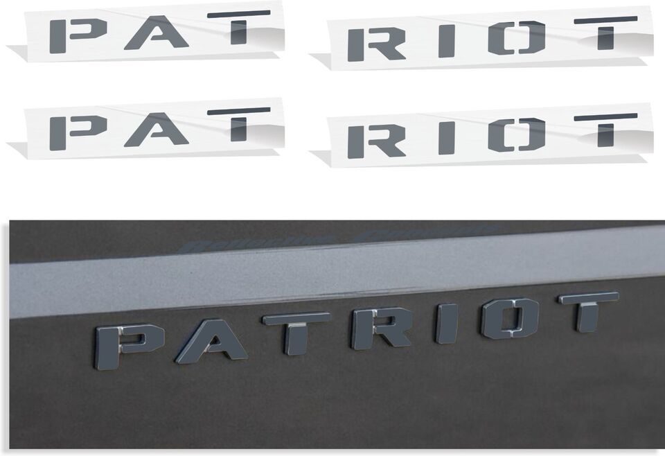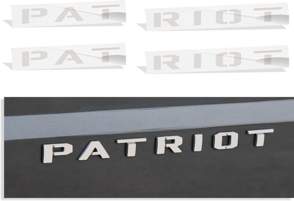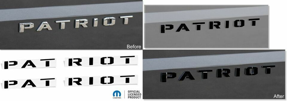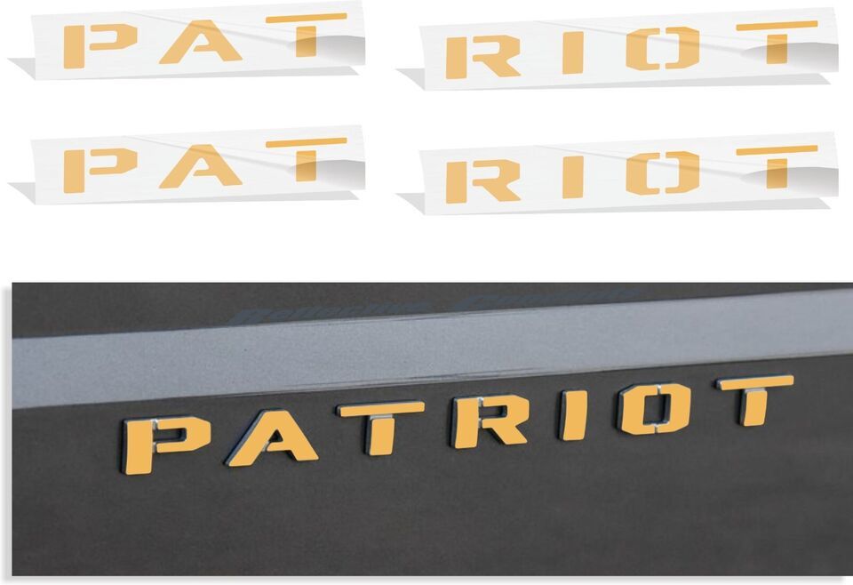 Decals (stickers) designed to overlay the front face of the factory PATRIOT nameplates on the doors.